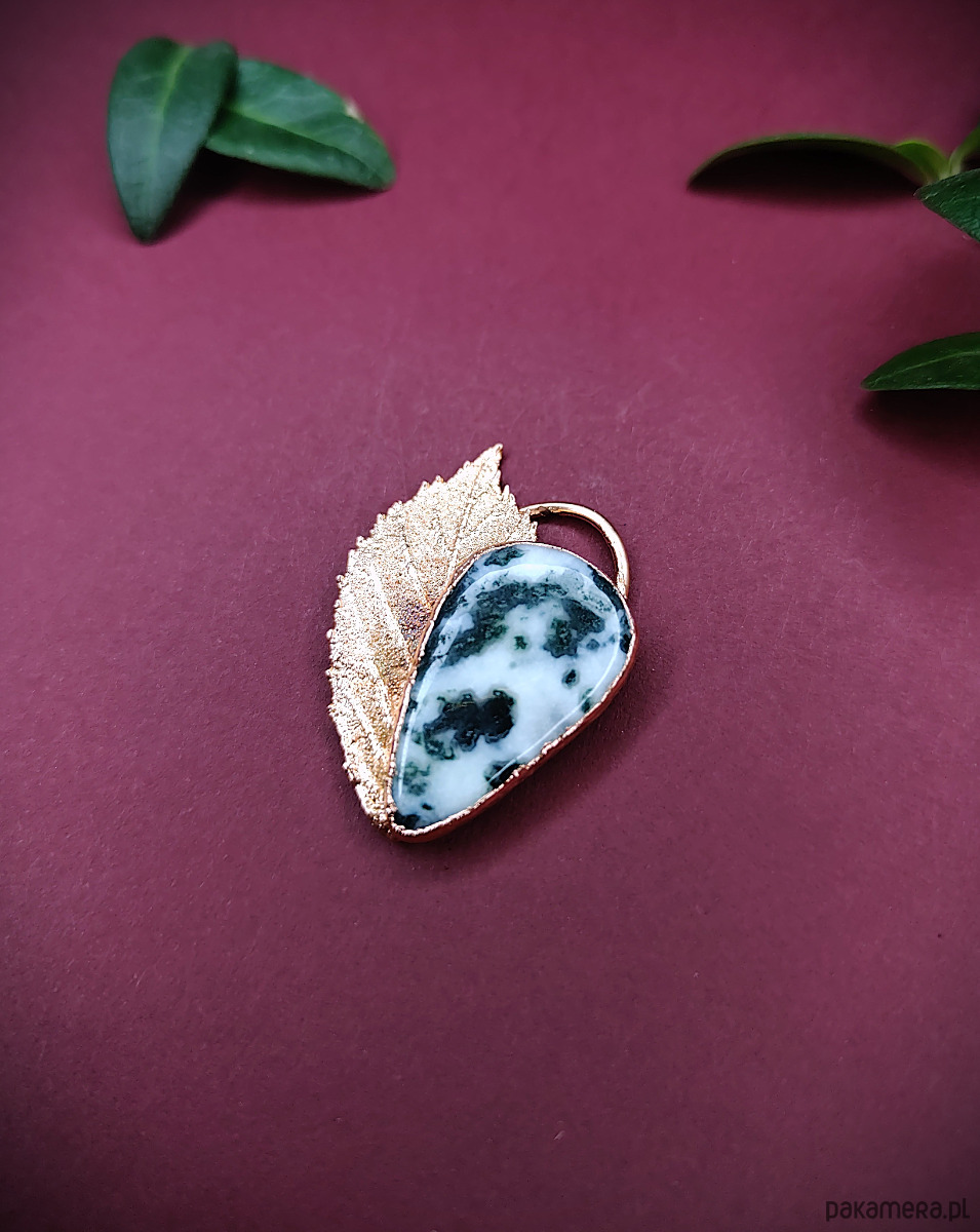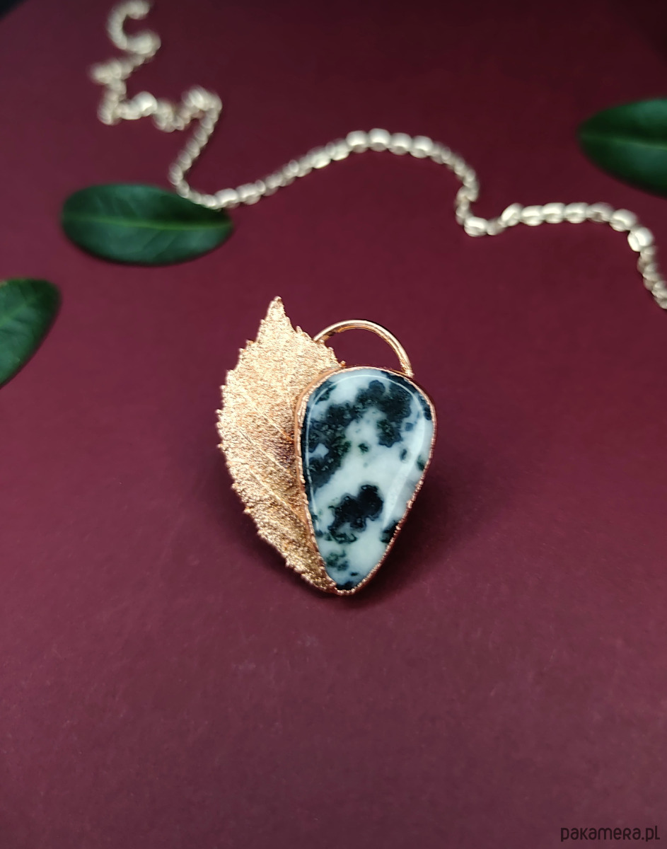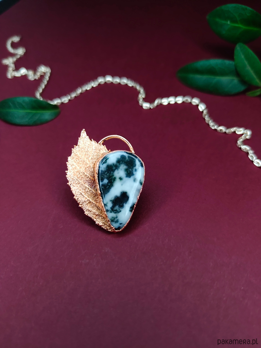 Miedziany wisiorek Liść Jeżyny z Agatem Drzewnym - Talizman siły natury i wewnętrznej stabilności