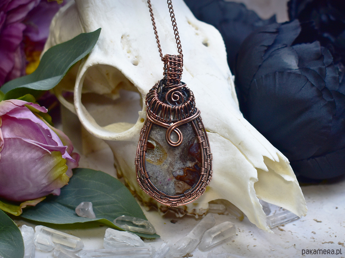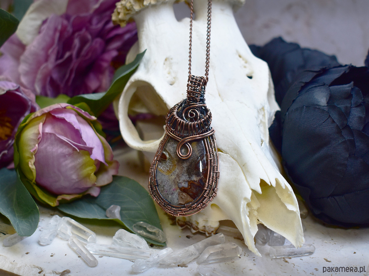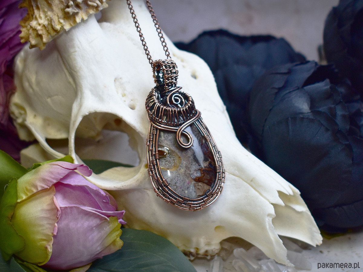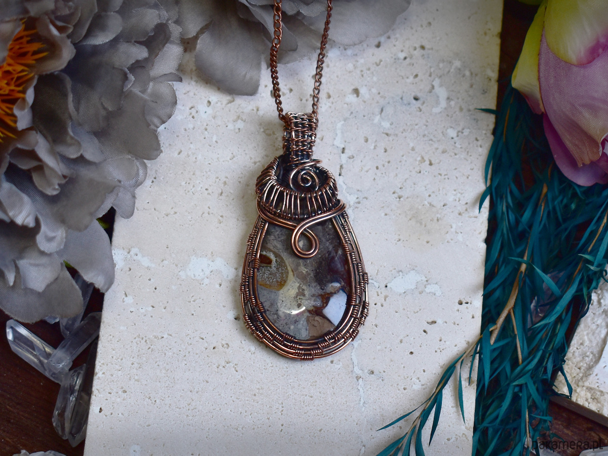 Miedziany wisiorek wire wrapping z jaspisem Coffee Bean