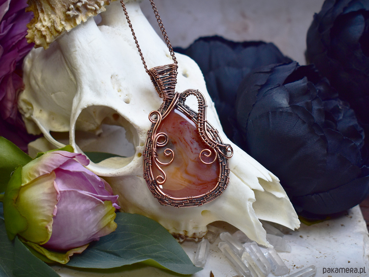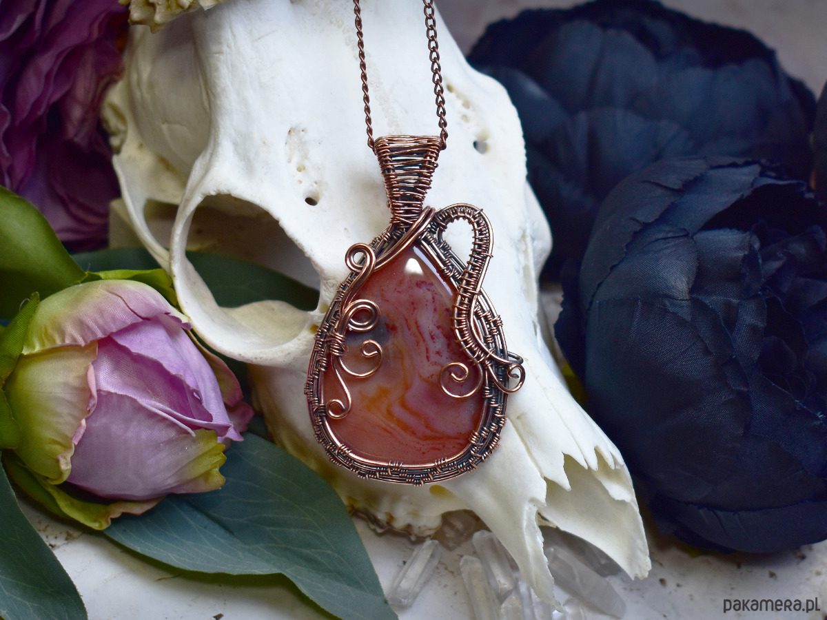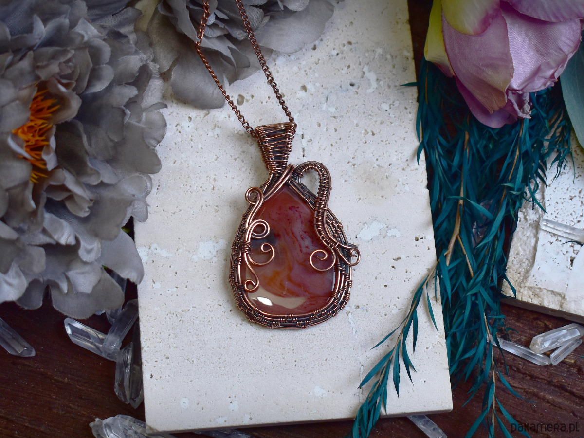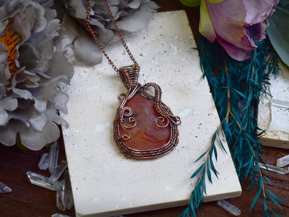 Miedziany wisiorek wykonany techniką wire wrapping, ozdobiony czerwonym agatem mszystym – kamieniem o głębokiej, ziemistej barwie z charakterystycznymi inkluzjami przypominającymi naturalne struktury roślinne. Agat mszysty uznawany jest za kamień wzrostu, stabilizacji i połączenia z naturą. Wspiera wewnętrzną równowagę, wzmacnia poczucie bezpieczeństwa oraz pomaga zachować spokój i wytrwałość w codziennych wyzwaniach. Czerwona odmiana tego kamienia dodatkowo kojarzona jest z energią życiową, siłą i odwagą. Połączenie surowego piękna minerału z ręcznie formowanym miedzianym oplataniem tworzy harmonijną, organiczną kompozycję, podkreślającą naturalny charakter biżuterii. Wisiorek doskonale sprawdzi się jako wyjątkowy amulet dla osób ceniących rękodzieło, naturę i biżuterię o symbolicznym znaczeniu.