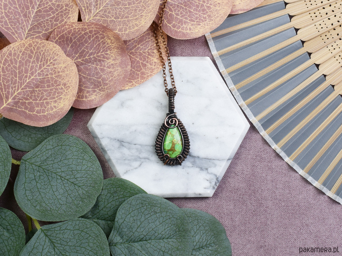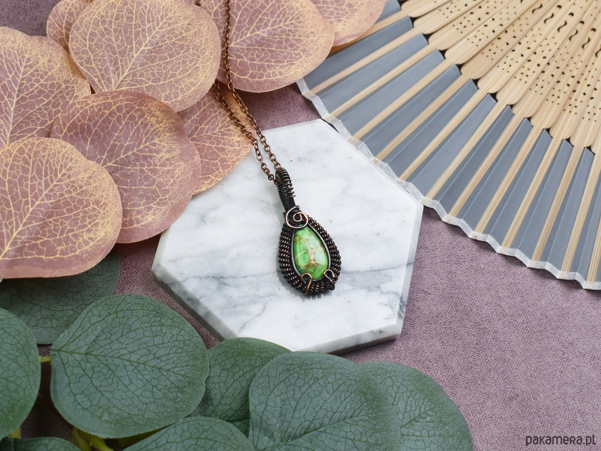 Miedziany wisiorek, ręcznie wykonany techniką wire wrapping, emanuje prostotą i naturalnym pięknem. Jego centralnym elementem jest kamień jaspis imperialny, znany również jako cesarski jaspis. Odpowiednio zawinięty drutem miedzianym, kamień ten emanuje ciepłymi odcieniami brązu, złota i zieleni, dodając wisiorkowi unikalnego uroku. To nie tylko biżuteria, lecz również wyraz sztuki rzemieślniczej, który wnosi do codziennego stylu subtelność i naturalny wdzięk.