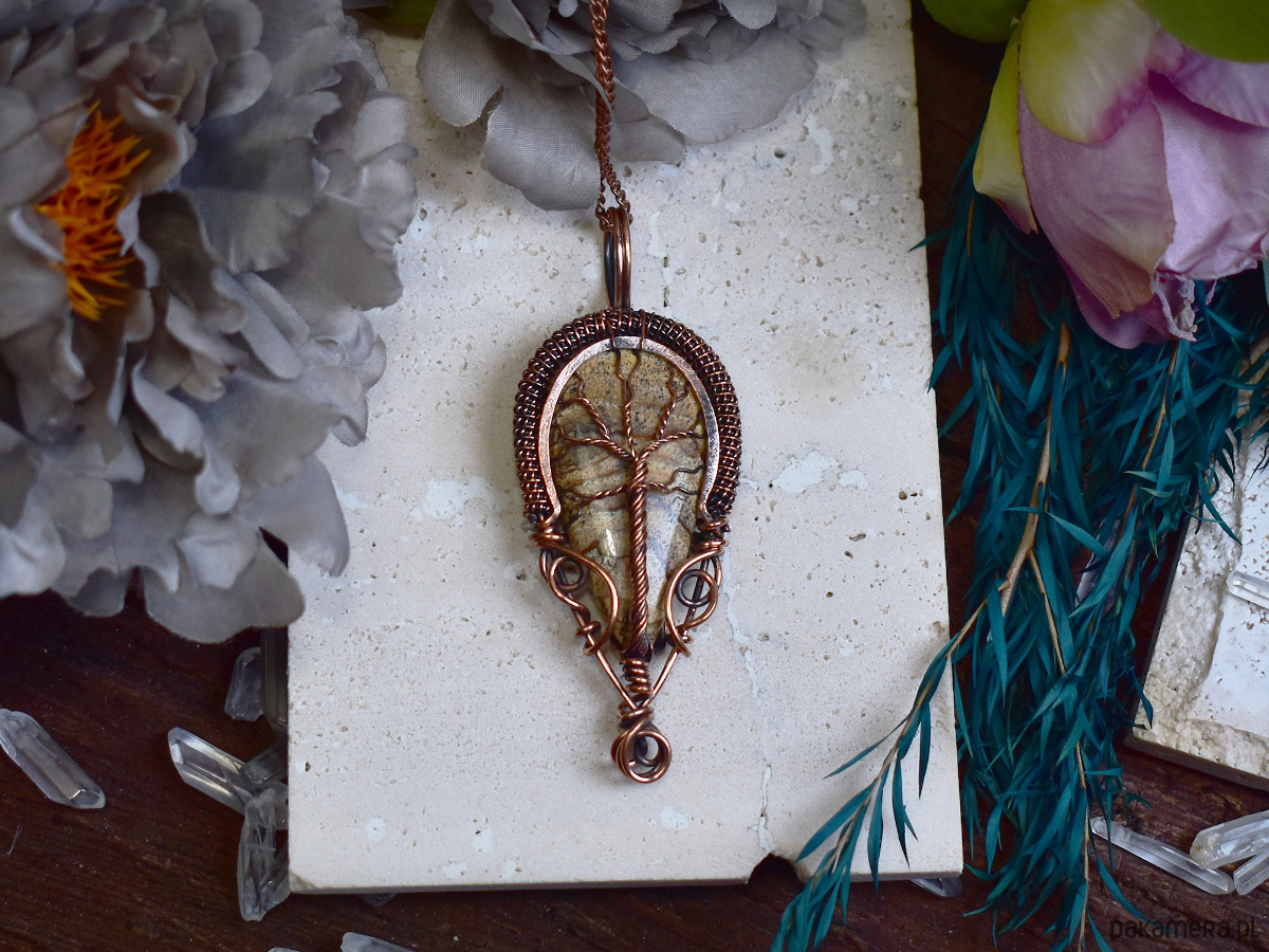 Miedziany wisiorek wire wrapping z jaspisem obrazkowym - drzewo życia
