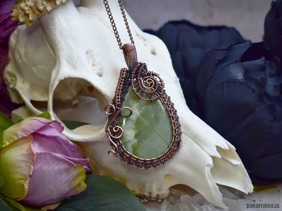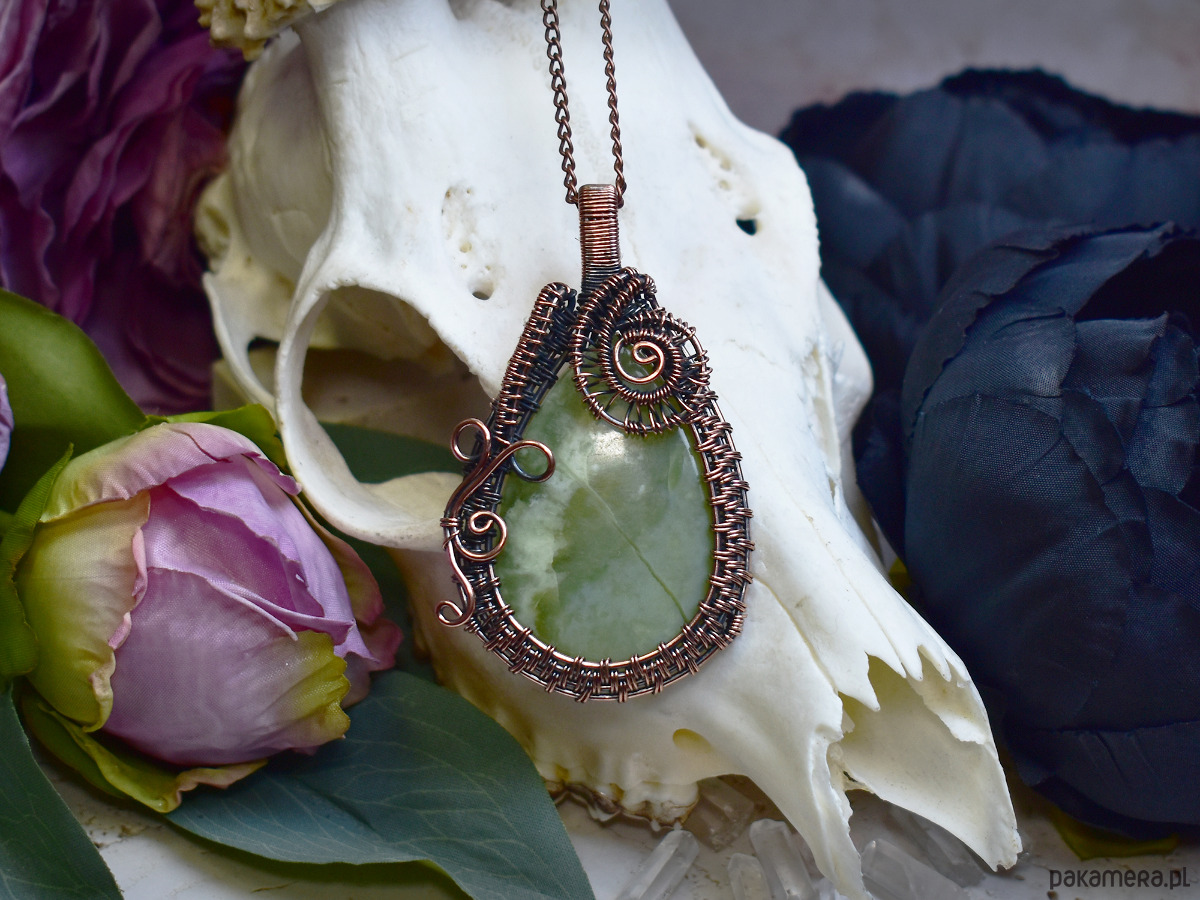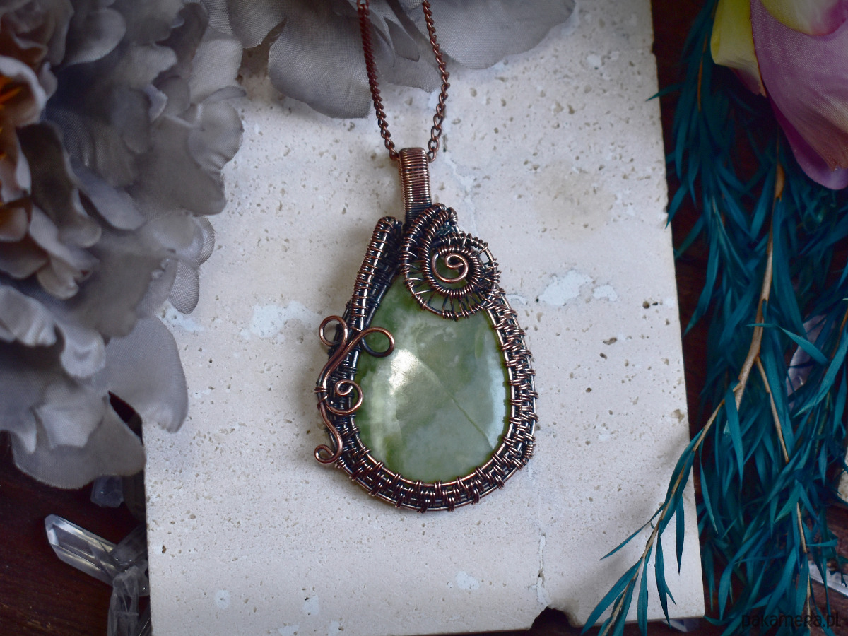 Miedziany wisiorek wykonany techniką wire wrapping, ozdobiony larsonitem – kamieniem o spokojnych, kremowo-zielonych odcieniach z subtelnymi żyłkami. Larsonit uważany jest za kamień harmonii, cierpliwości i równowagi emocjonalnej. Wspiera skupienie, wyciszenie umysłu oraz poczucie spokoju w codziennym życiu. Połączenie naturalnego piękna larsonitu z ręcznie formowanym miedzianym oplataniem tworzy elegancką, organiczną kompozycję, podkreślającą delikatność i subtelny charakter kamienia. Wisiorek sprawdzi się jako wyjątkowy amulet dla osób ceniących rękodzieło, biżuterię inspirowaną naturą i symbolem wewnętrznej równowagi.