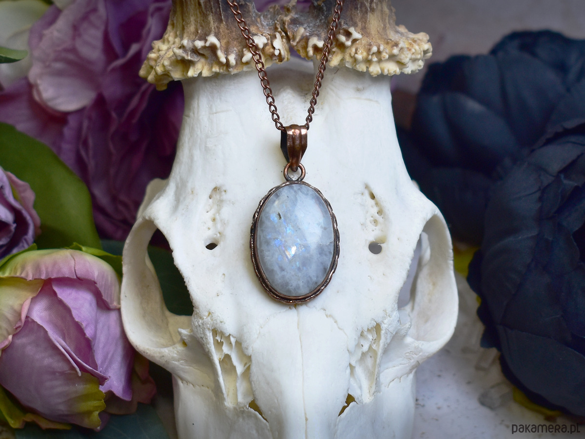 Miedziany wisiorek wykonany tradycyjnymi metodami rzemieślniczymi, ozdobiony kamieniem księżycowym o subtelnych, opalizujących odcieniach bieli i kremu. Kamień księżycowy od wieków kojarzony jest z intuicją, wewnętrzną równowagą i łagodną, kobiecą energią. Jego delikatny blask pięknie kontrastuje z ciepłym odcieniem miedzi, tworząc elegancką i harmonijną kompozycję. Wisiorek łączy klasyczną formę z naturalnym pięknem minerału, nadając biżuterii ponadczasowy charakter. To wyjątkowy wybór dla osób ceniących rękodzieło, tradycyjne rzemiosło oraz biżuterię o symbolicznym znaczeniu i subtelnej, mistycznej aurze.