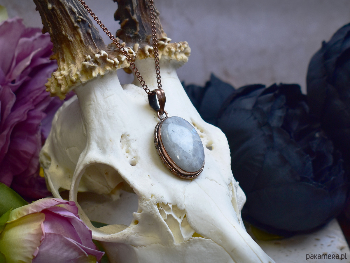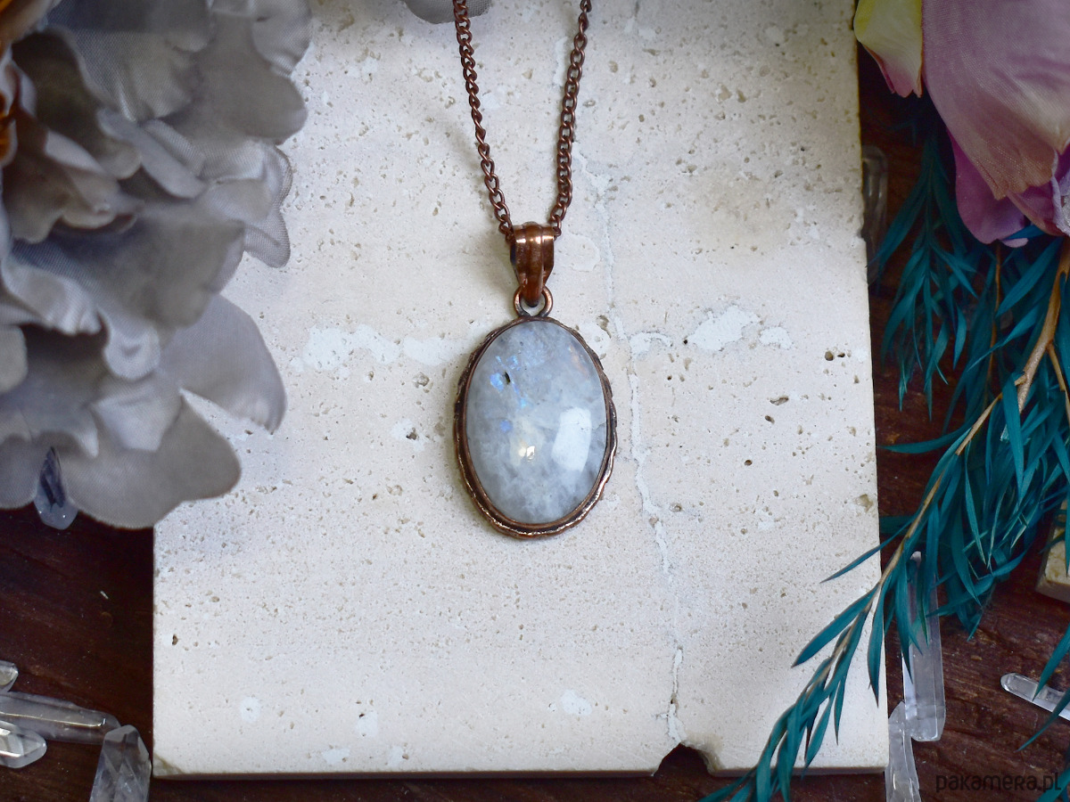 Miedziany wisiorek z kamieniem księżycowym w prostej ozdobnej oprawie