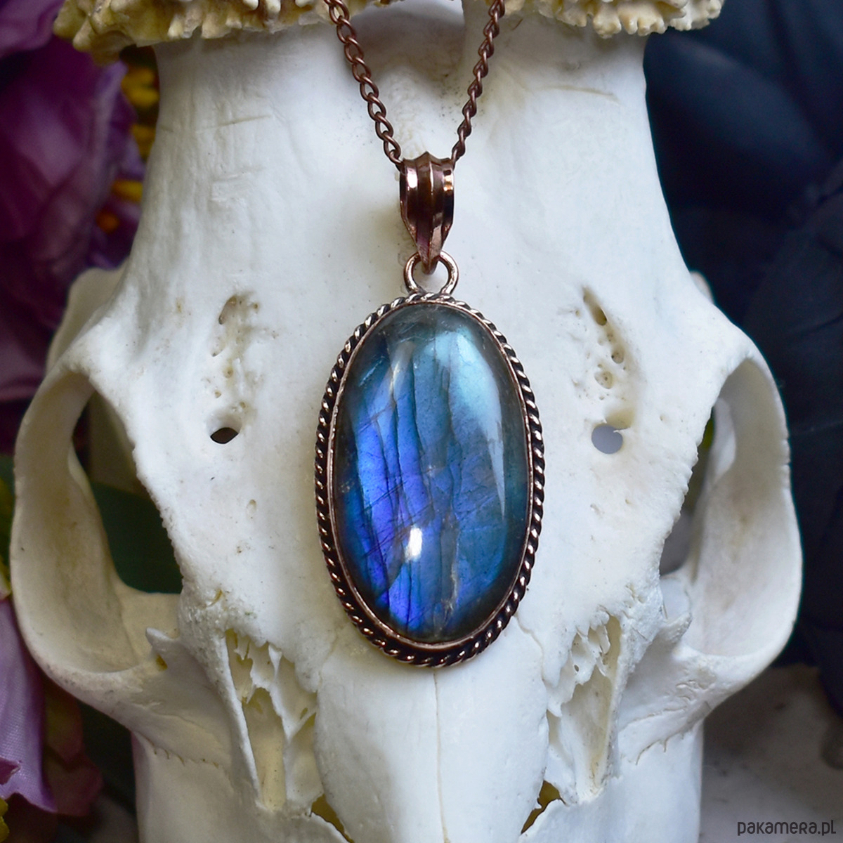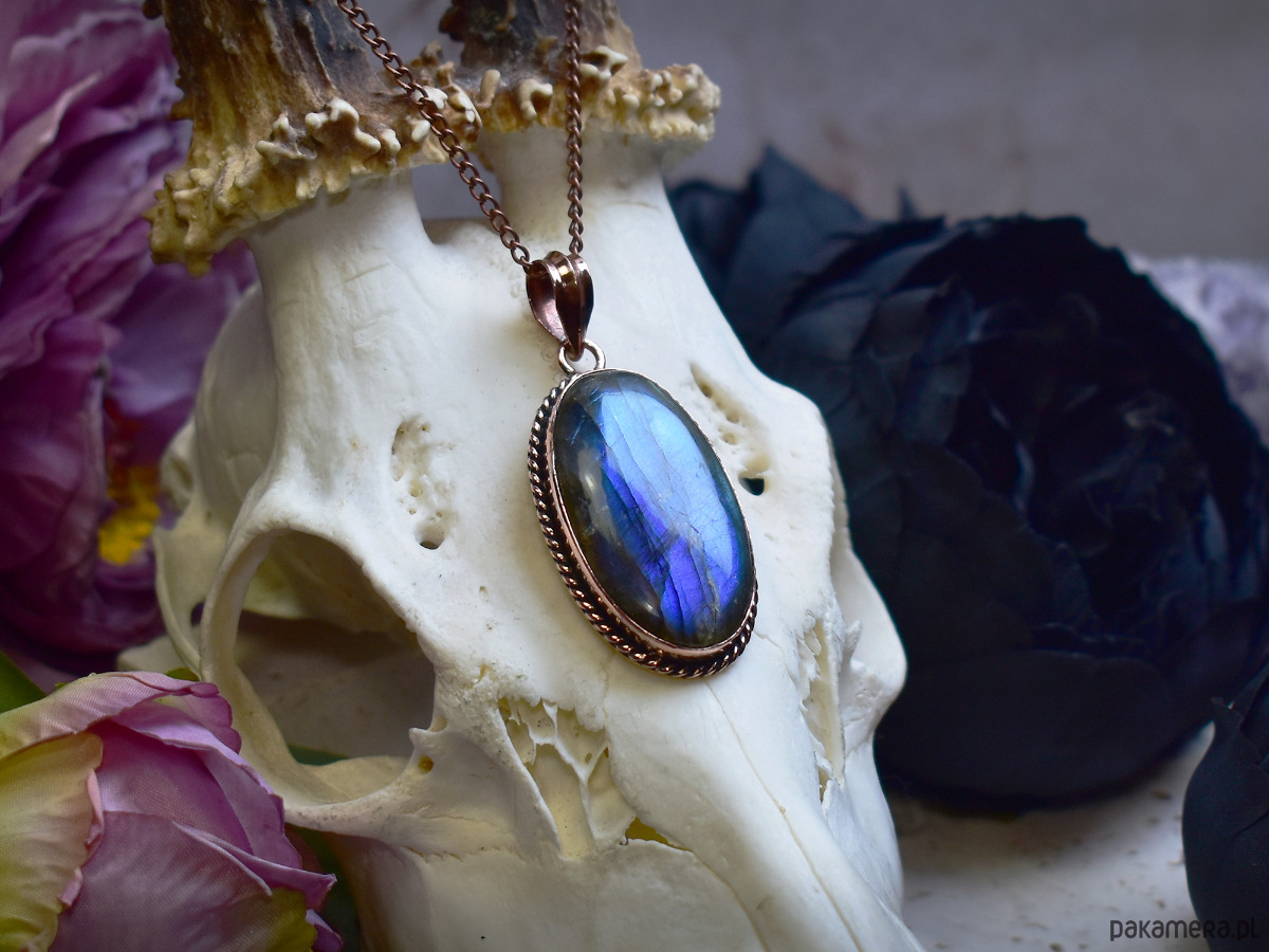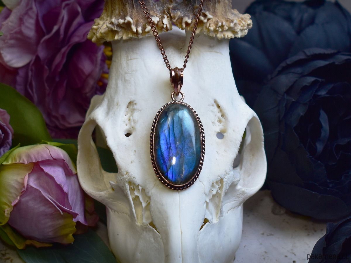 Miedziany wisiorek wykonany tradycyjnymi metodami rzemieślniczymi, ozdobiony niebieskim labradorytem – kamieniem o hipnotyzującym, opalizującym połysku i głębokich odcieniach niebieskiego. Labradoryt znany jest ze swoich właściwości ochronnych i wzmacniających intuicję, sprzyja wyciszeniu umysłu oraz wspiera koncentrację i równowagę emocjonalną. Jego naturalny blask pięknie kontrastuje z ciepłym odcieniem miedzi, tworząc elegancką i harmonijną kompozycję. Wisiorek łączy klasyczną, ręcznie wykonaną formę z fascynującym pięknem minerału, nadając biżuterii ponadczasowy, subtelnie mistyczny charakter. To wyjątkowa propozycja dla osób ceniących rękodzieło, unikatowe kamienie i biżuterię o symbolicznym znaczeniu.