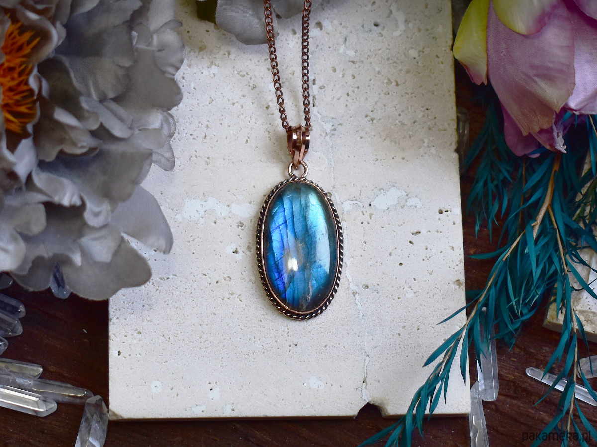 Miedziany wisiorek z labradorytem w prostej ozdobnej oprawie