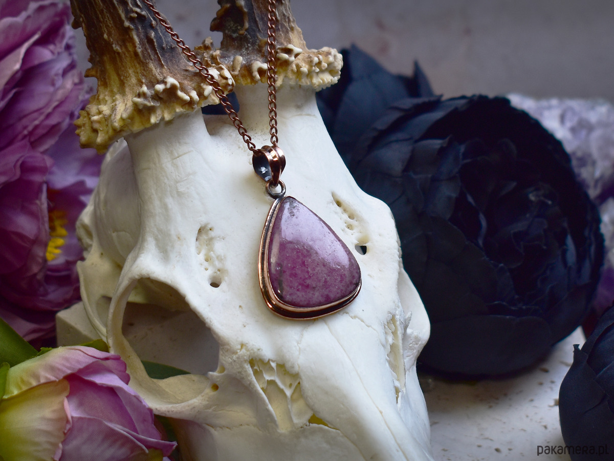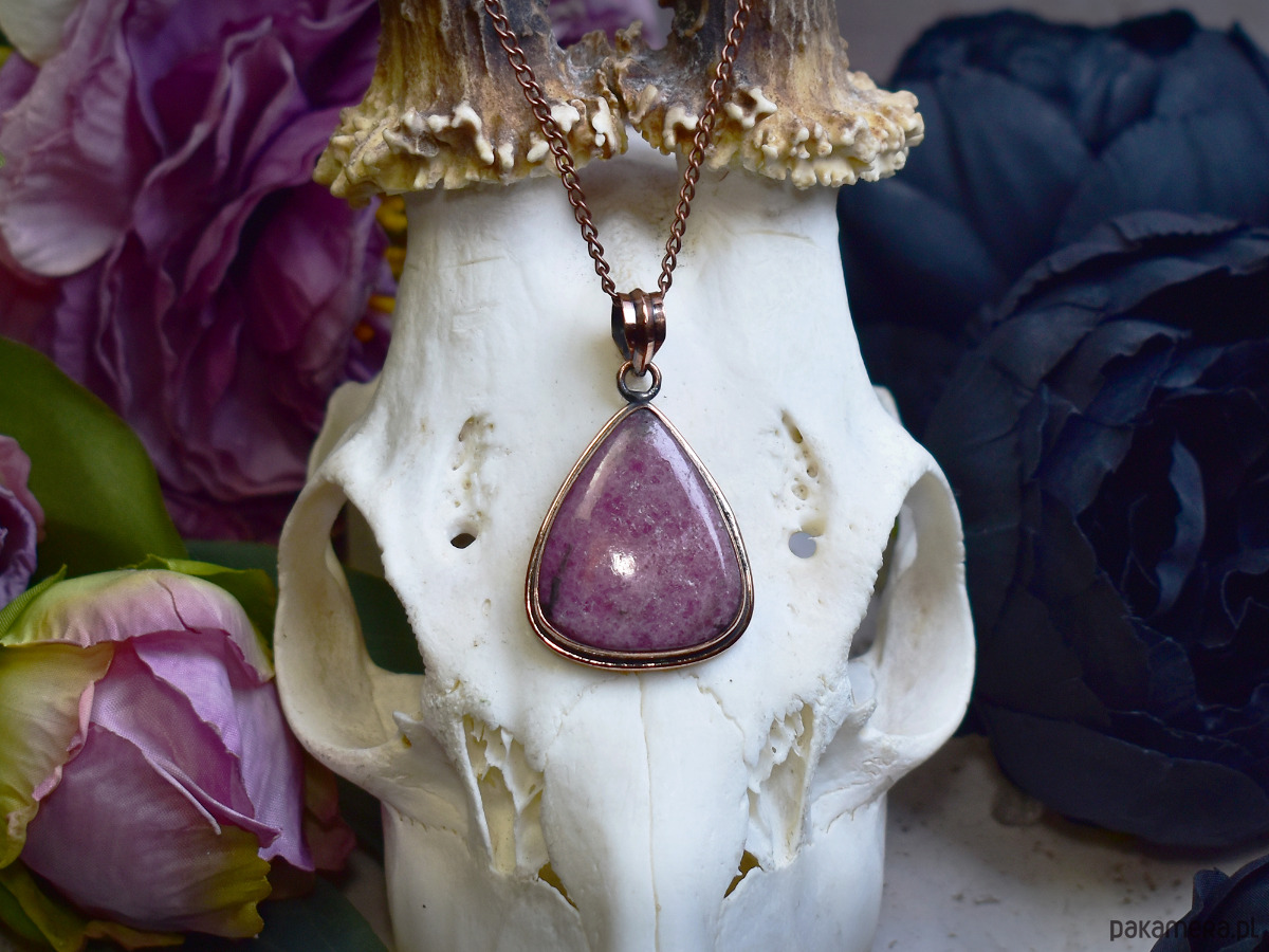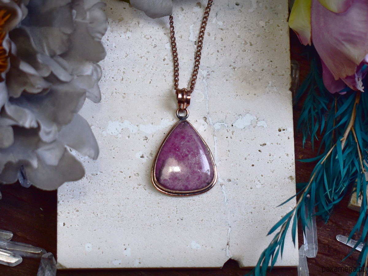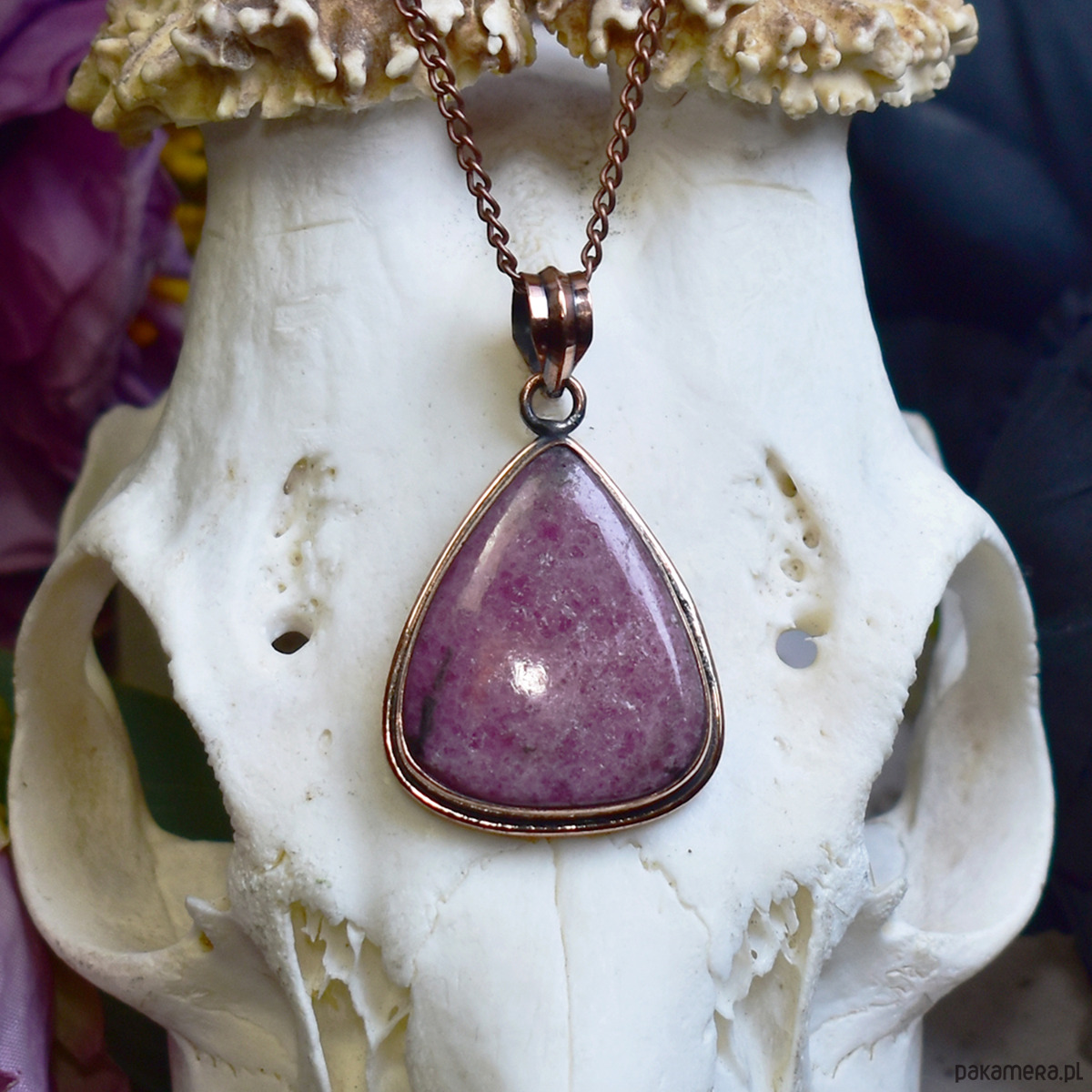 Miedziany wisiorek wykonany tradycyjnymi metodami rzemieślniczymi, ozdobiony rodonitem – kamieniem o pięknej, różowej barwie z charakterystycznymi ciemniejszymi żyłkami. Rodonit znany jest ze swoich właściwości wspierających emocjonalną równowagę, otwierających serce na miłość i współczucie oraz wzmacniających poczucie własnej wartości. Kontrast delikatnego różu kamienia z ciepłym odcieniem miedzi tworzy elegancką, harmonijną kompozycję, podkreślającą naturalne piękno minerału. Wisiorek łączy klasyczną, ręcznie wykonaną formę z wyjątkowym urokiem rodonitu, nadając biżuterii ponadczasowy i subtelnie mistyczny charakter. To idealna propozycja dla osób ceniących rękodzieło, unikatowe kamienie oraz biżuterię o symbolicznym znaczeniu.