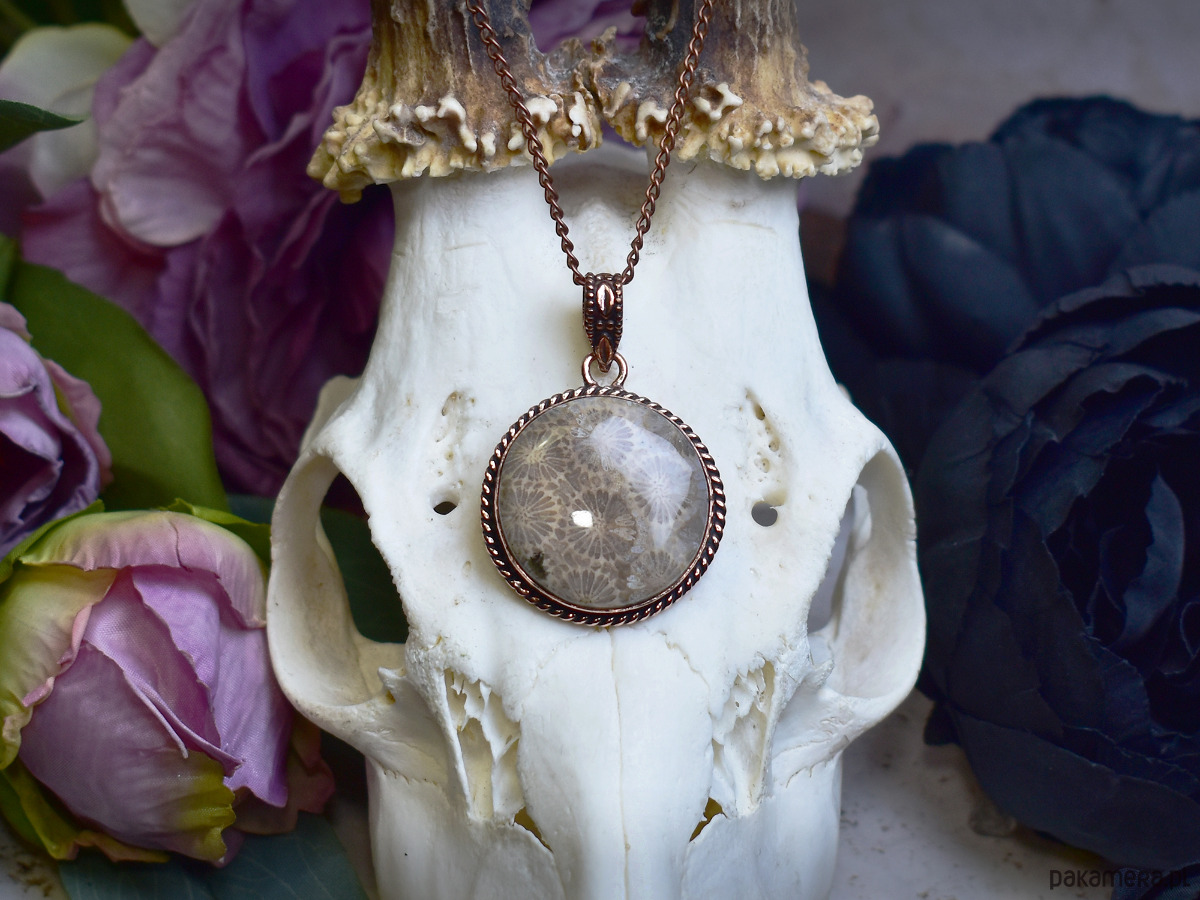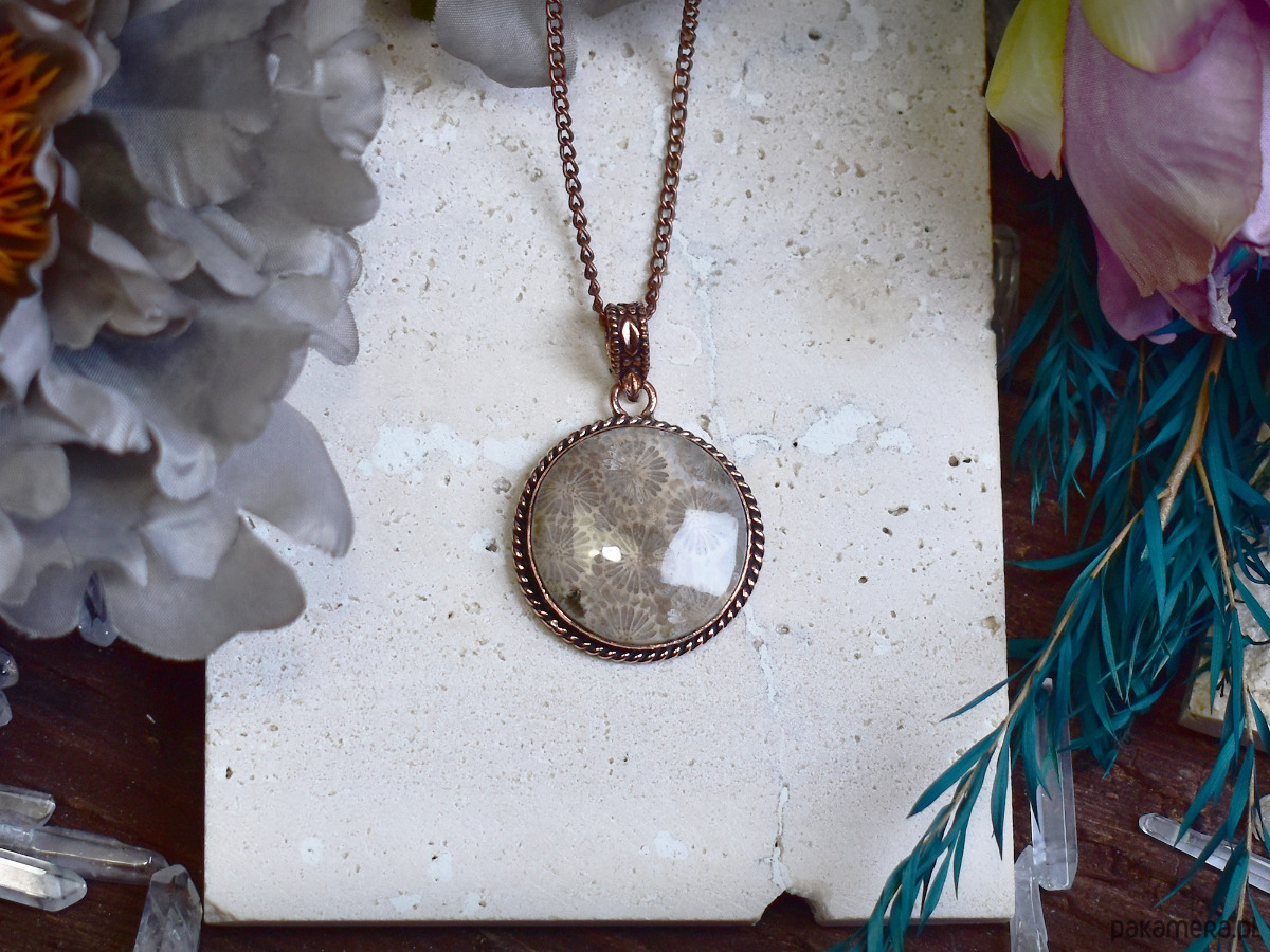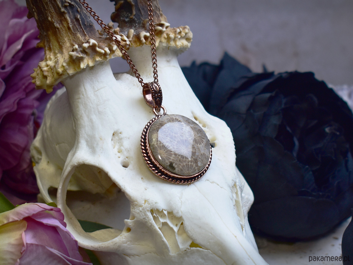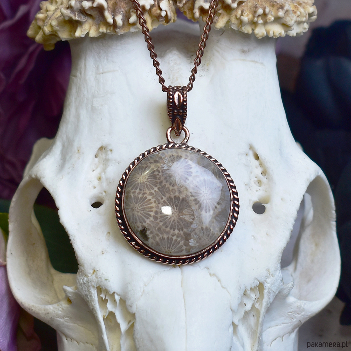 Miedziany wisiorek ze skamieliną koralowca w prostej ozdobnej oprawie