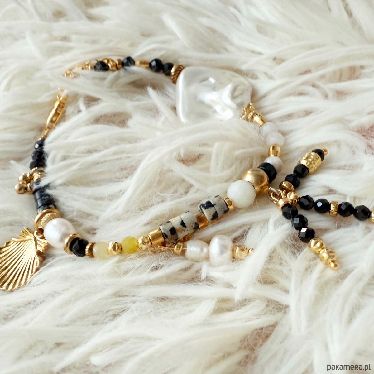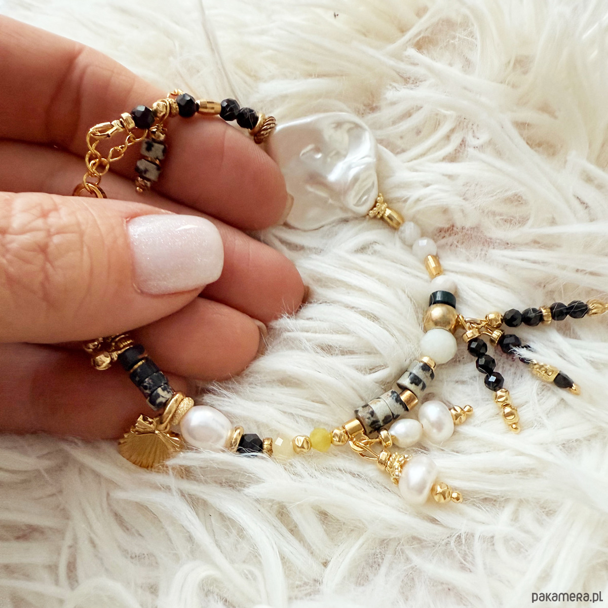 Wśród naturalnych kamieni pojawia się jaspis cesarski – energetyczny, symbolizujący wewnętrzną równowagę i spokój. Żółty cytryn wprowadza radość, ciepło dodając blasku i pozytywnej energii. Delikatne koralikowe frędzle z onyksu, kamienia ochrony i siły wewnętrznej, przeplatają się z kamieniem księżycowym, który dodaje całości eteryczności, podkreślając intuicję i kobiecą wrażliwość. Perły – odwieczny symbol delikatności, mądrości i harmonii – dopełniają kompozycję, a jaspis dalmatyński wnosi nutę radości.