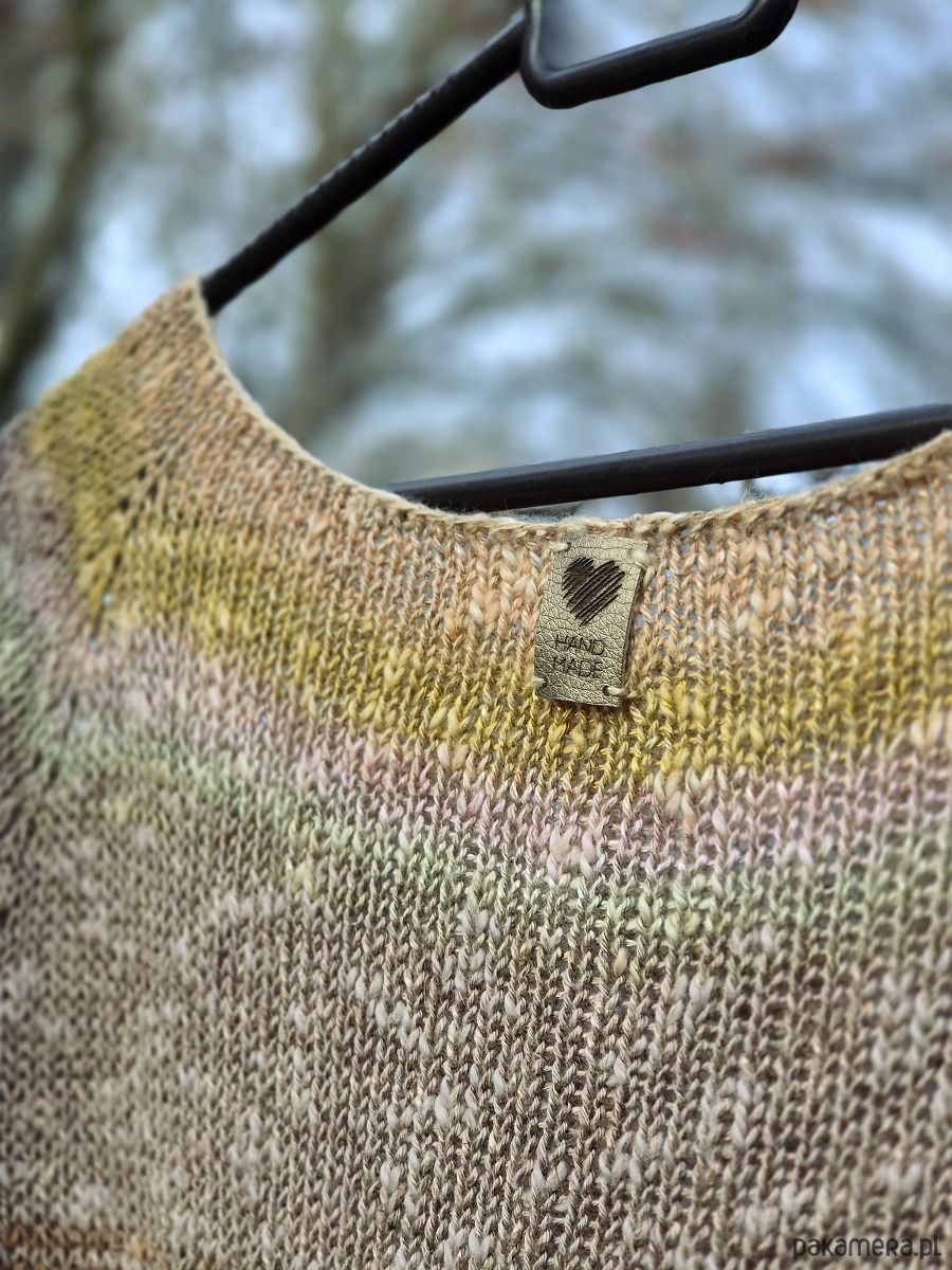 Prosty sweter z lekko rozszerzonymi rękawami, wykonany ręcznie/ na drutach. Fajny w dotyku. Powstał z wysokiej jakości włóczki na sezon sezon wiosna/ lato ze względu na skład: len przyjemnie chłodzi, wiskoza szybko pochłania wilgoć i szybko schnie, dodatkowo bawełna.