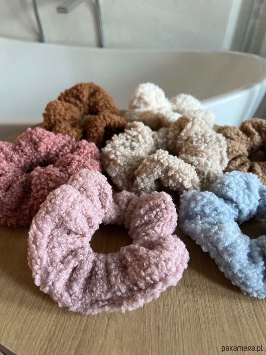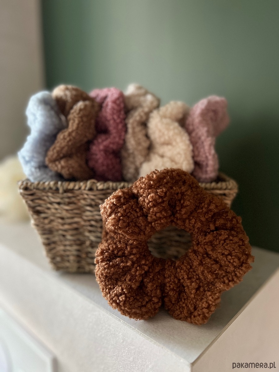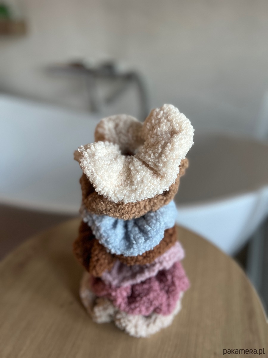 Scrunchie wykonana z miękkiego materiału typu baranek / teddy — przyjemna w dotyku, lekka i delikatna dla włosów. Świetnie sprawdzi się na co dzień, do domowych stylizacji, spacerów i zimowych outfitów.