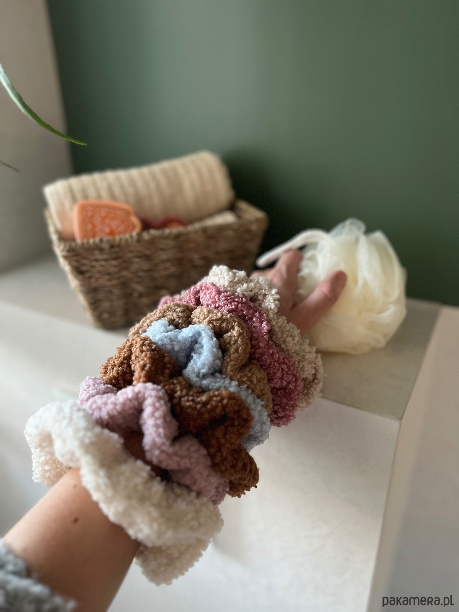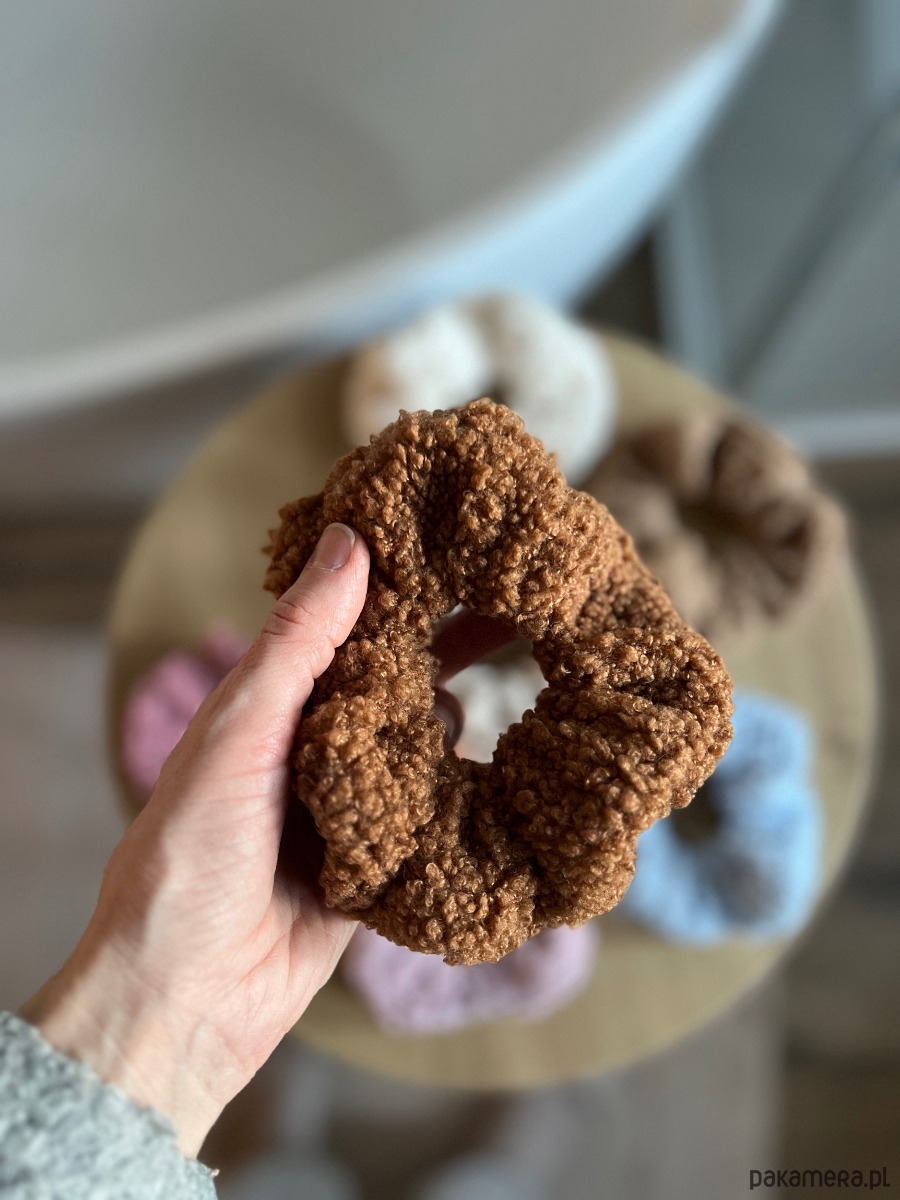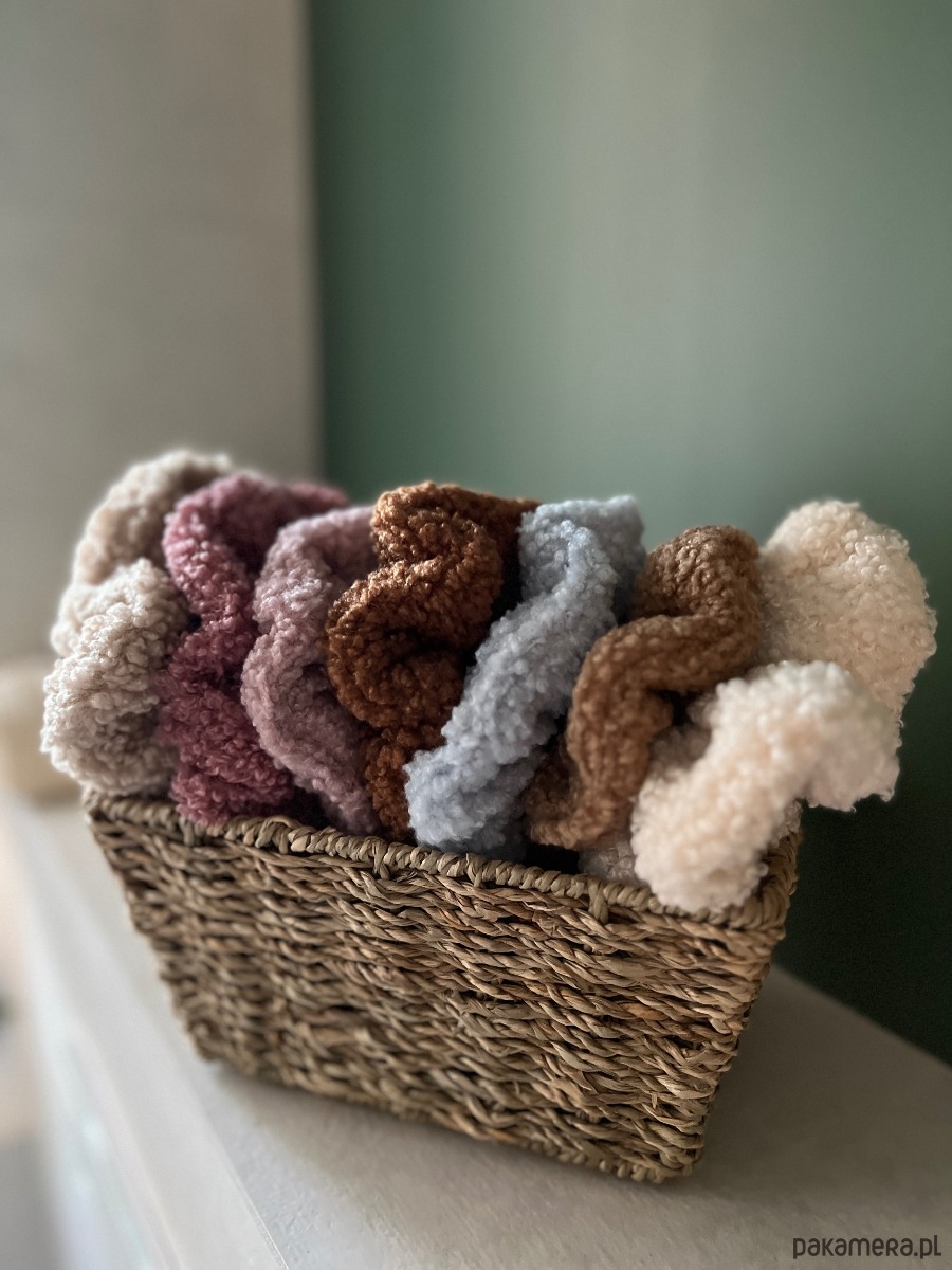 Scrunchie wykonana z miękkiego materiału typu baranek / teddy — przyjemna w dotyku, lekka i delikatna dla włosów. Świetnie sprawdzi się na co dzień, do domowych stylizacji, spacerów i zimowych outfitów.