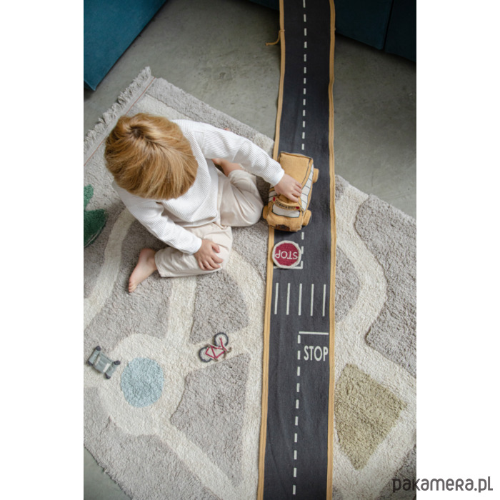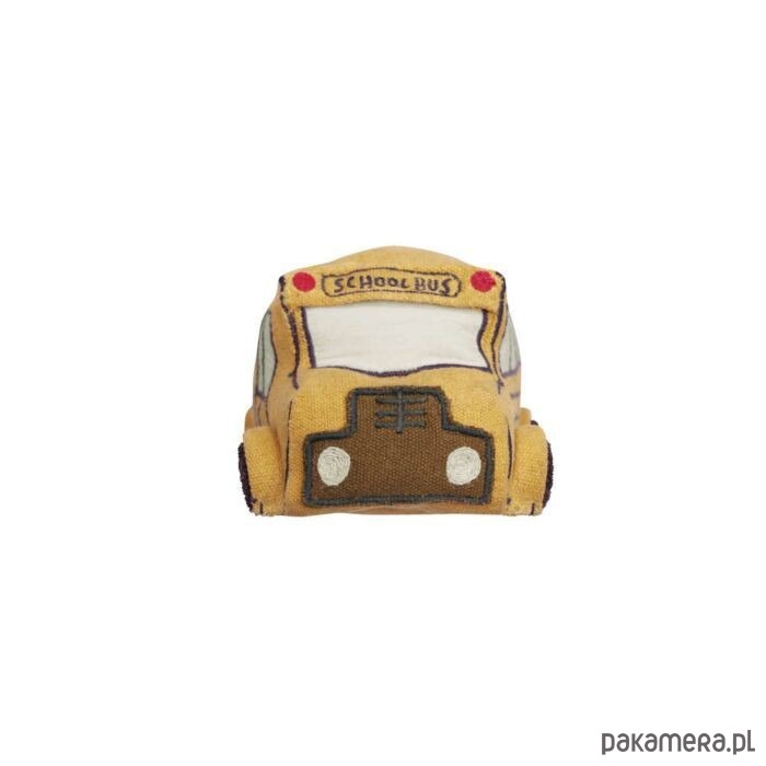 Autobus szkolny Ride&Roll składa się z miękkiego autobusu-zabawki wykonanego z miodowego płótna bawełnianego, z okienkami jako naszywkami i haftowanymi detalami oraz reflektorami. Ciemnoszare bawełniane pompony symulują koła, a nadrukowana etykieta służy jako tablica rejestracyjna. Autobus jest zwinięty w 4-metrową płócienną drogę w ciemnoszarym kolorze, z nadrukowanymi pasami, przejściami dla pieszych i miejscem do ładowania, wykończoną bawełnianą lamówką w kontrastowym kolorze na krawędziach. Mając sznureczki na brzegach, można go łatwo zwinąć i związać razem z autobusem szkolnym, zamieniając się w praktyczną teczkę