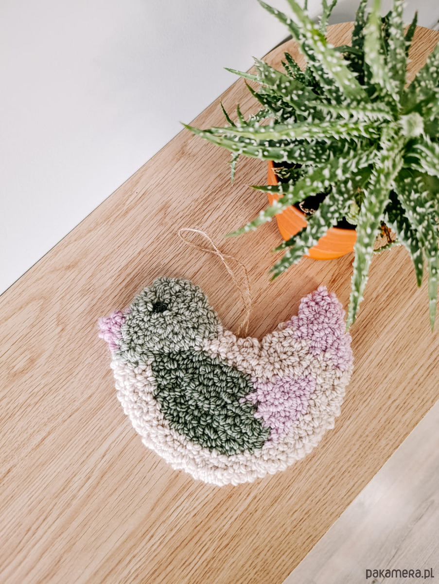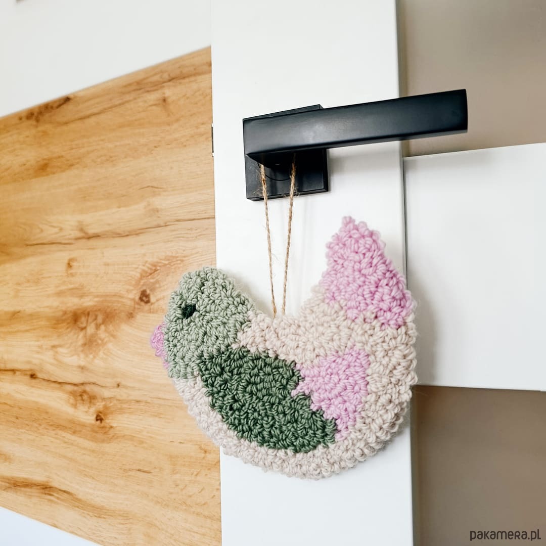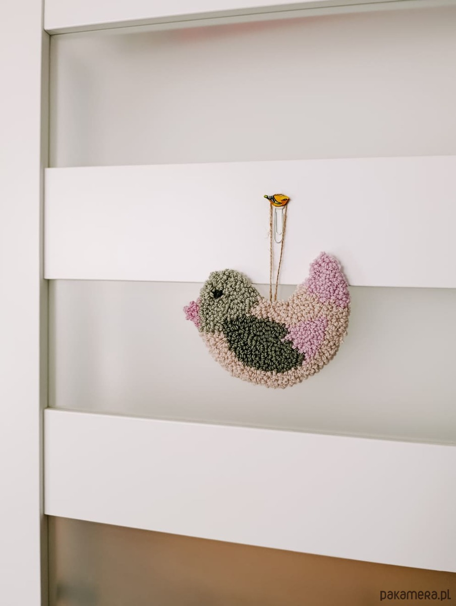Miękka pastelowa zawieszka ścienna w kształcie ptaszka. Zrobiona została w technice punch needle z miękkiej, wełnianej włóczki. Tył wykończony filcem, co zapewnia estetyczny wygląd i trwałość.