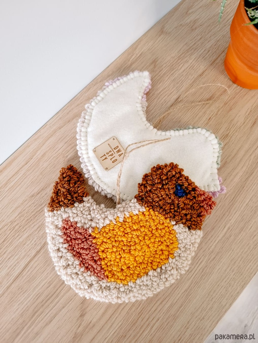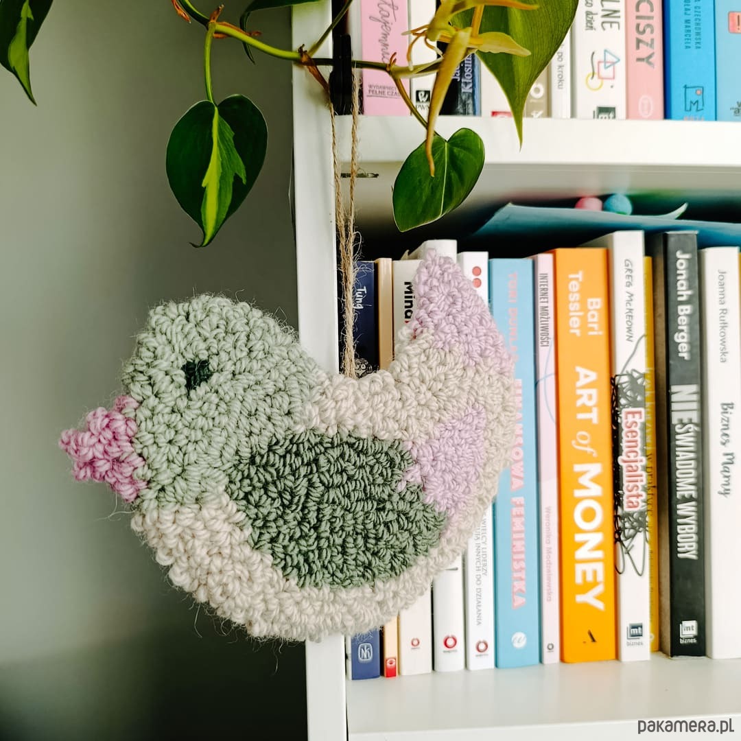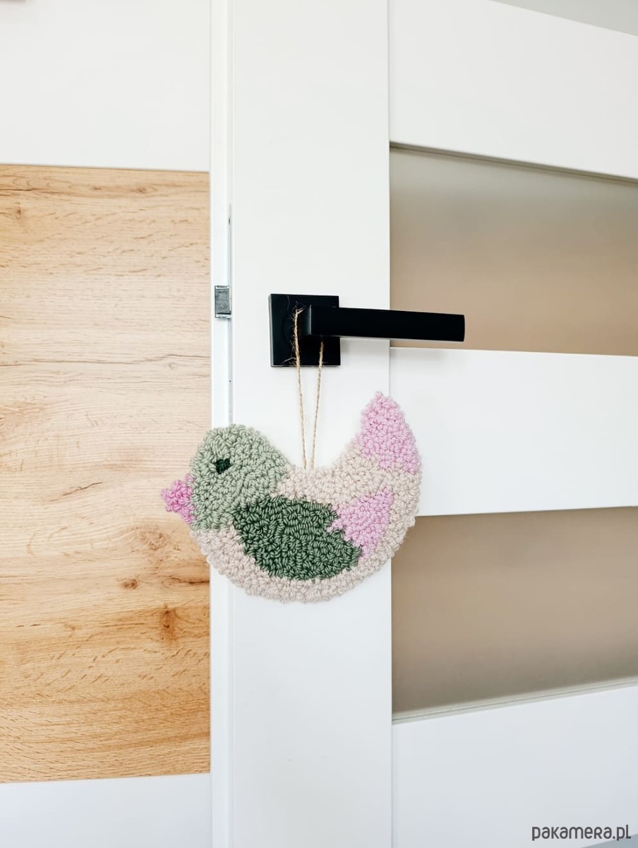 Miękka pastelowa zawieszka ścienna w kształcie ptaszka. Zrobiona została w technice punch needle z miękkiej, wełnianej włóczki. Tył wykończony filcem, co zapewnia estetyczny wygląd i trwałość.
