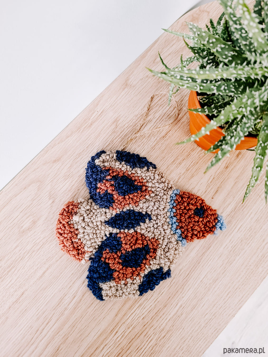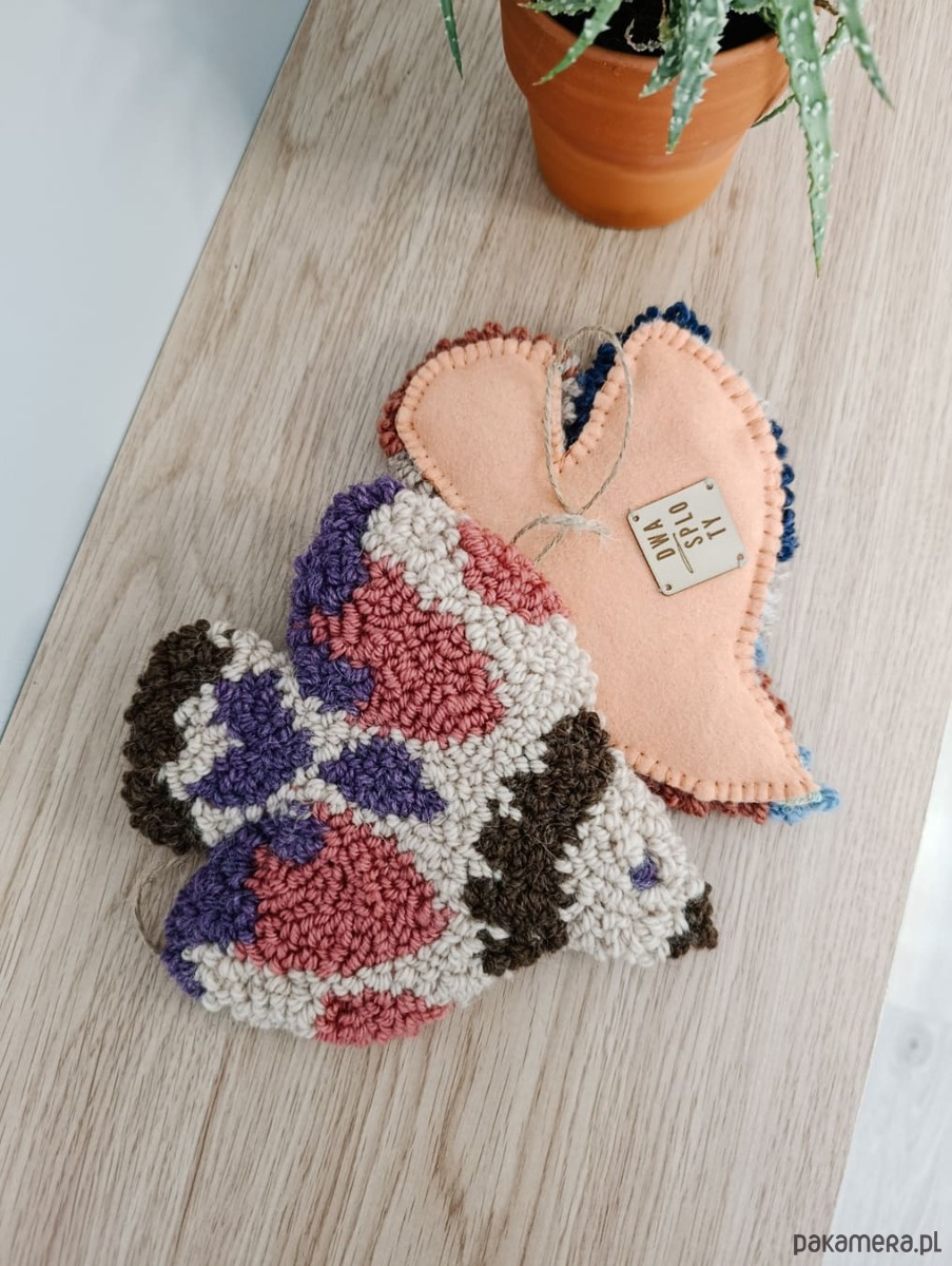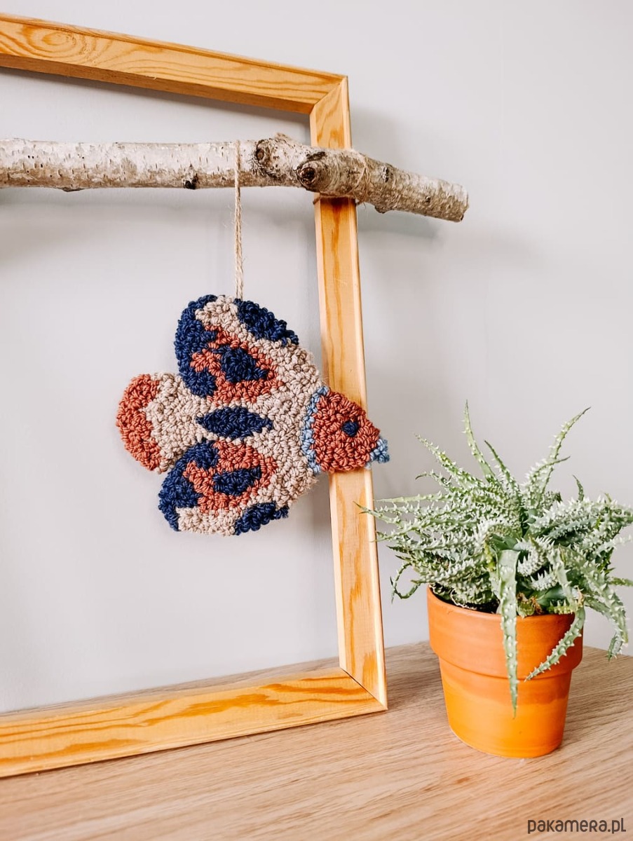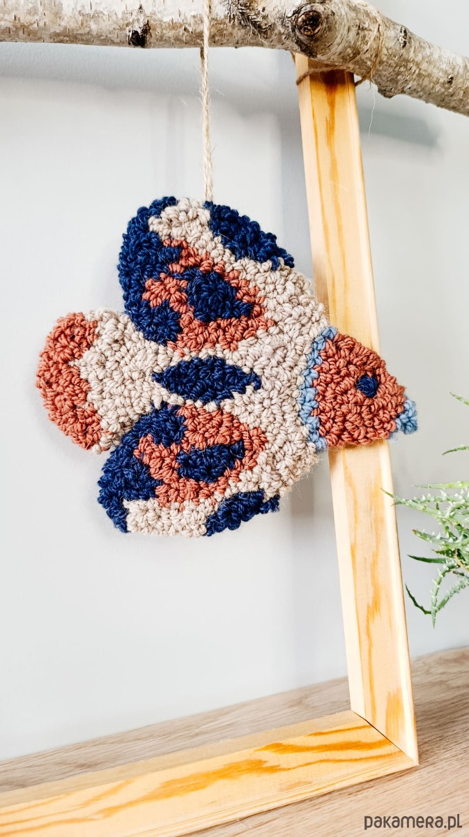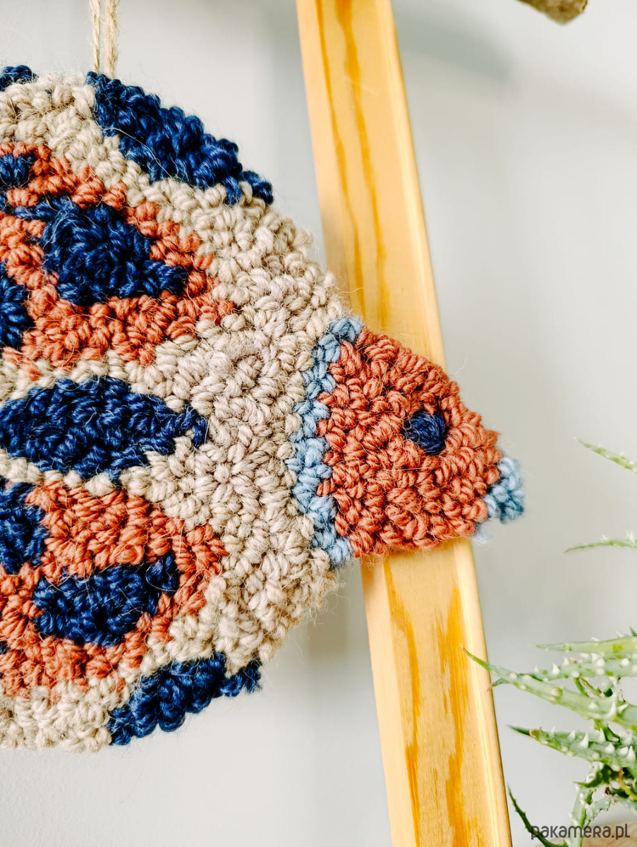 Miękka pastelowa zawieszka ścienna w kształcie ptaszka. Zrobiona została  w technice punch needle z miękkiej, wełnianej włóczki. Tył wykończony filcem, co zapewnia estetyczny wygląd i trwałość.