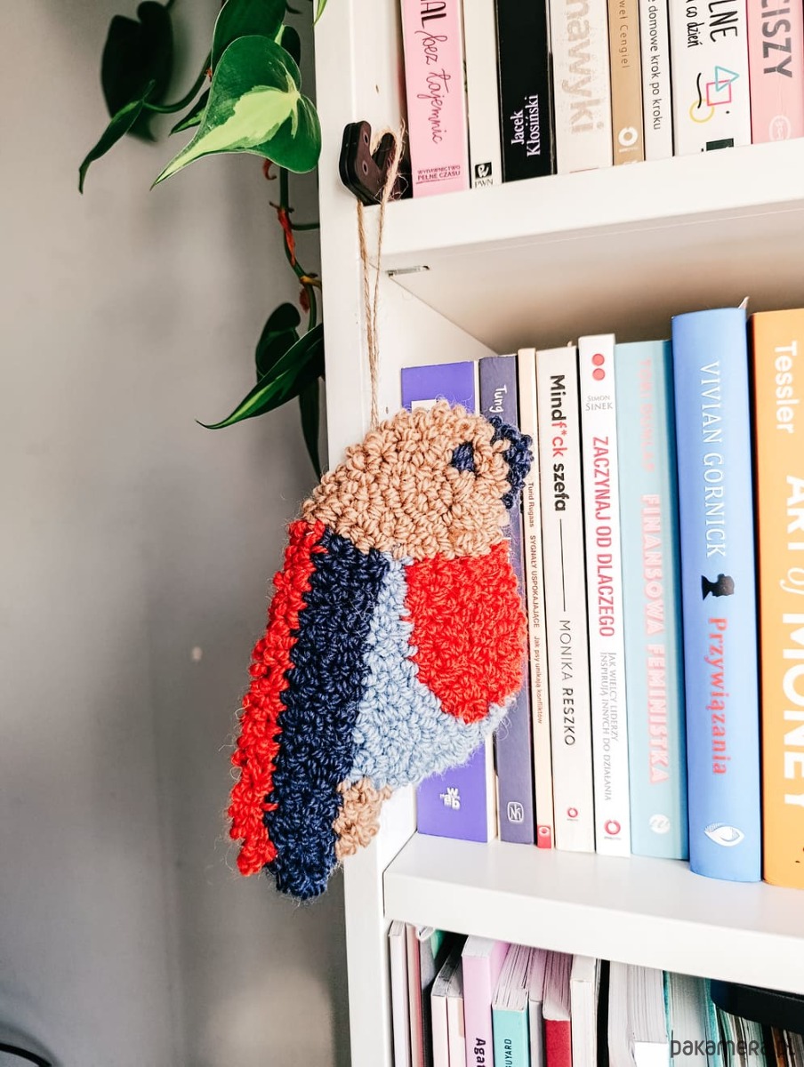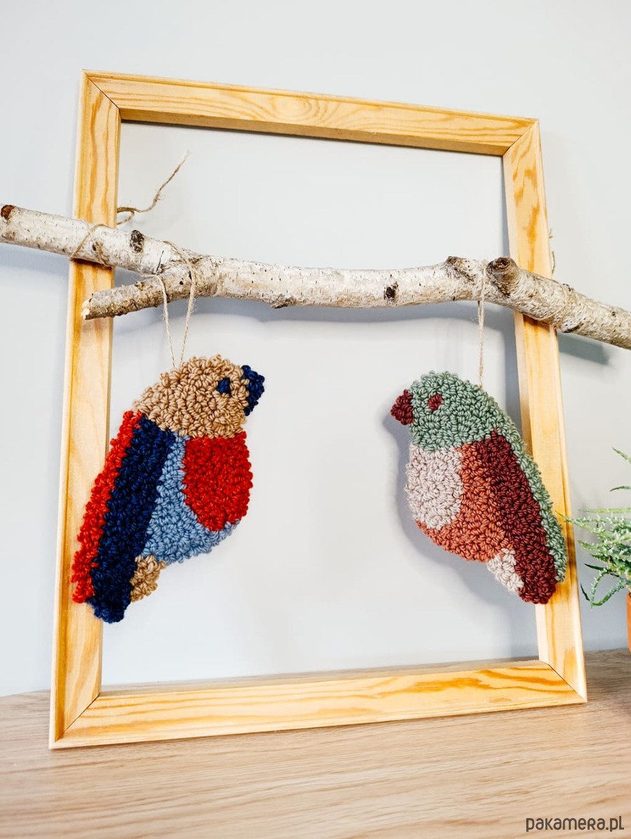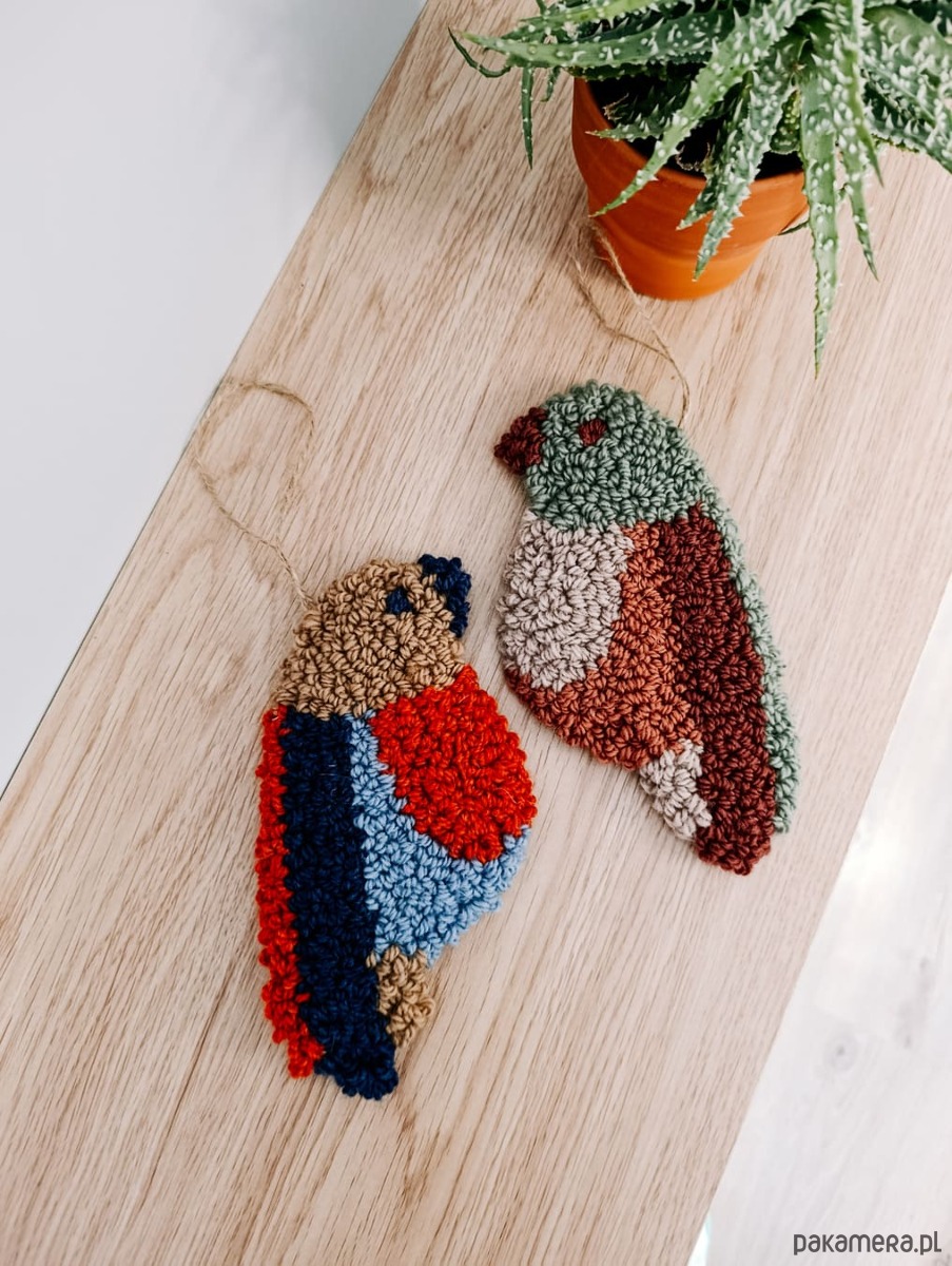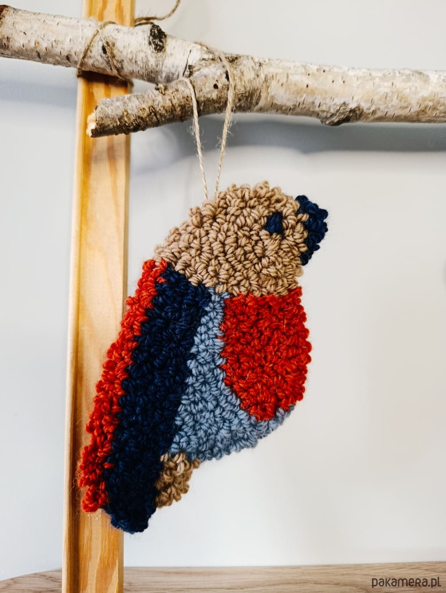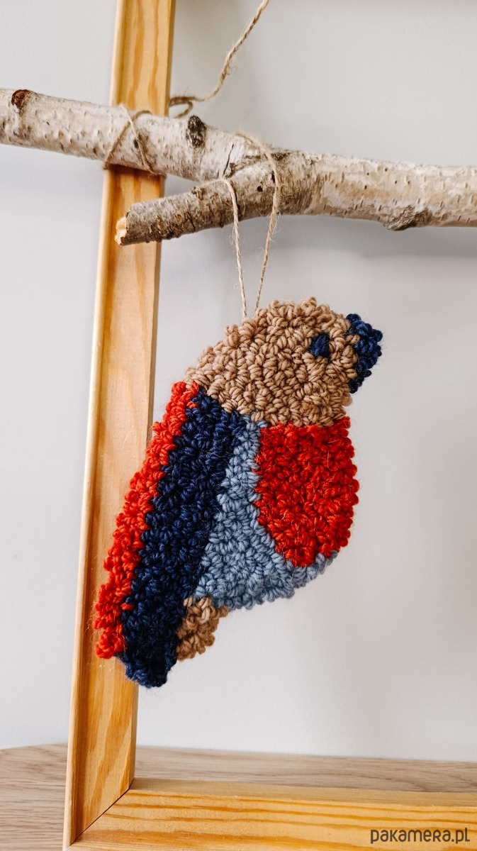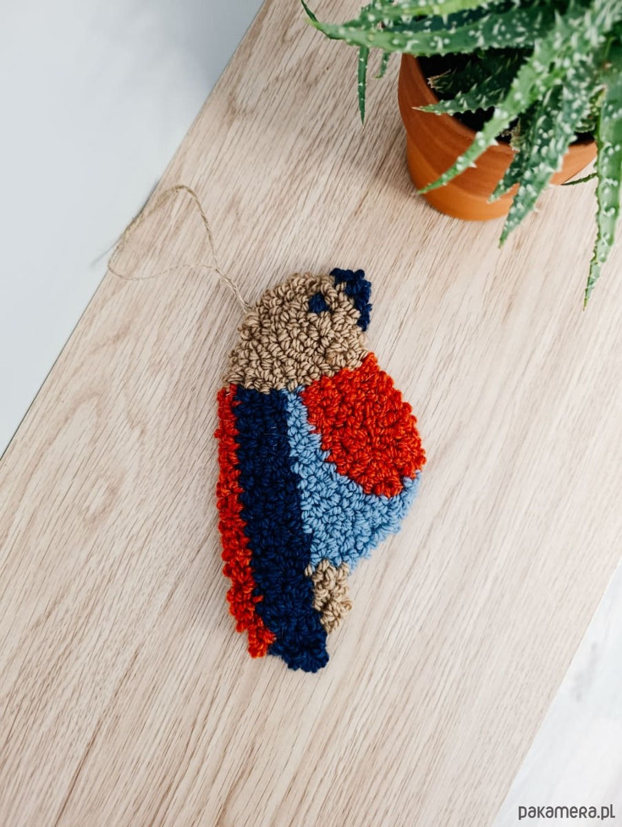 Miękka wełniana zawieszka ścienna w kształcie ptaszka. Zrobiona została  w technice punch needle z miękkiej, wełnianej włóczki. Tył wykończony filcem, co zapewnia estetyczny wygląd i trwałość.