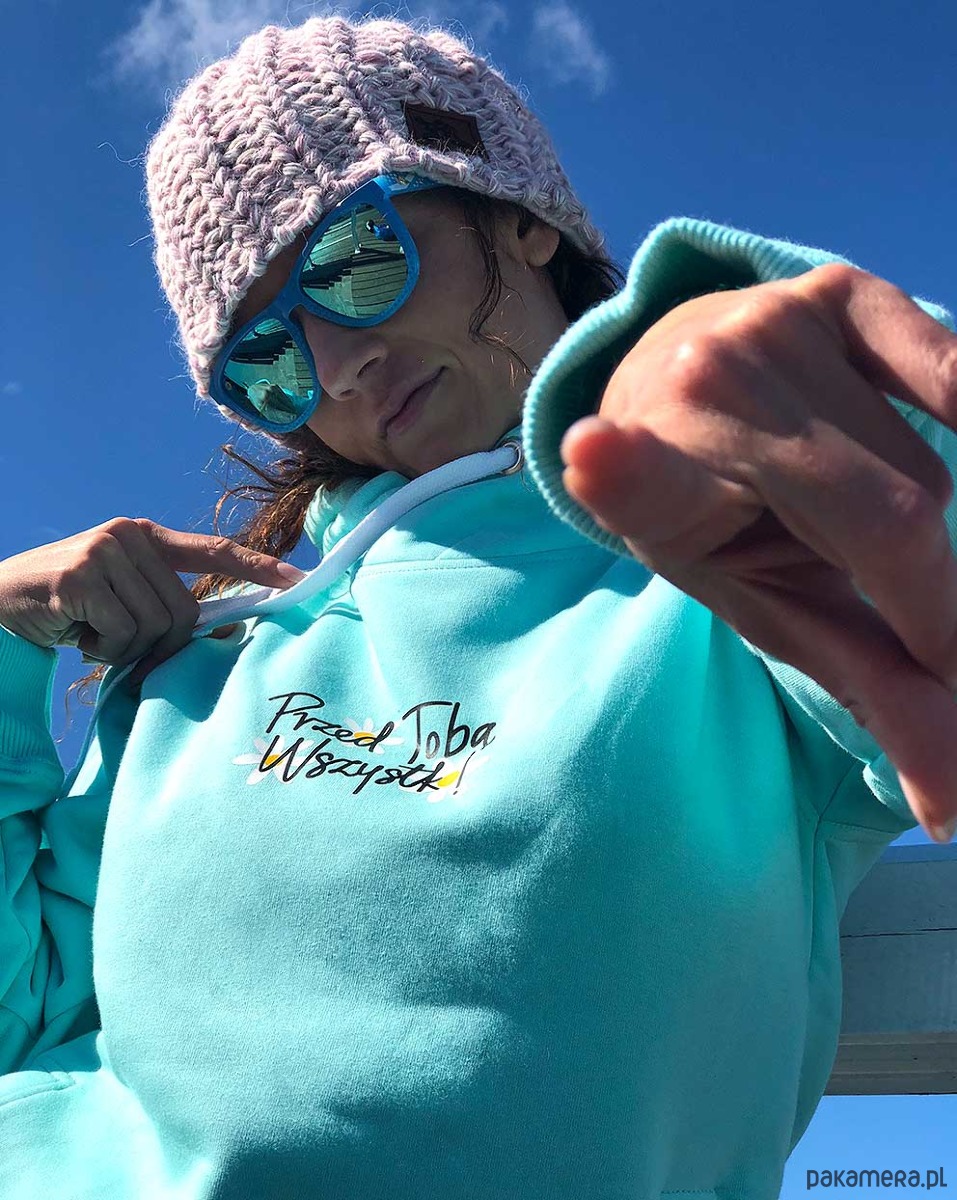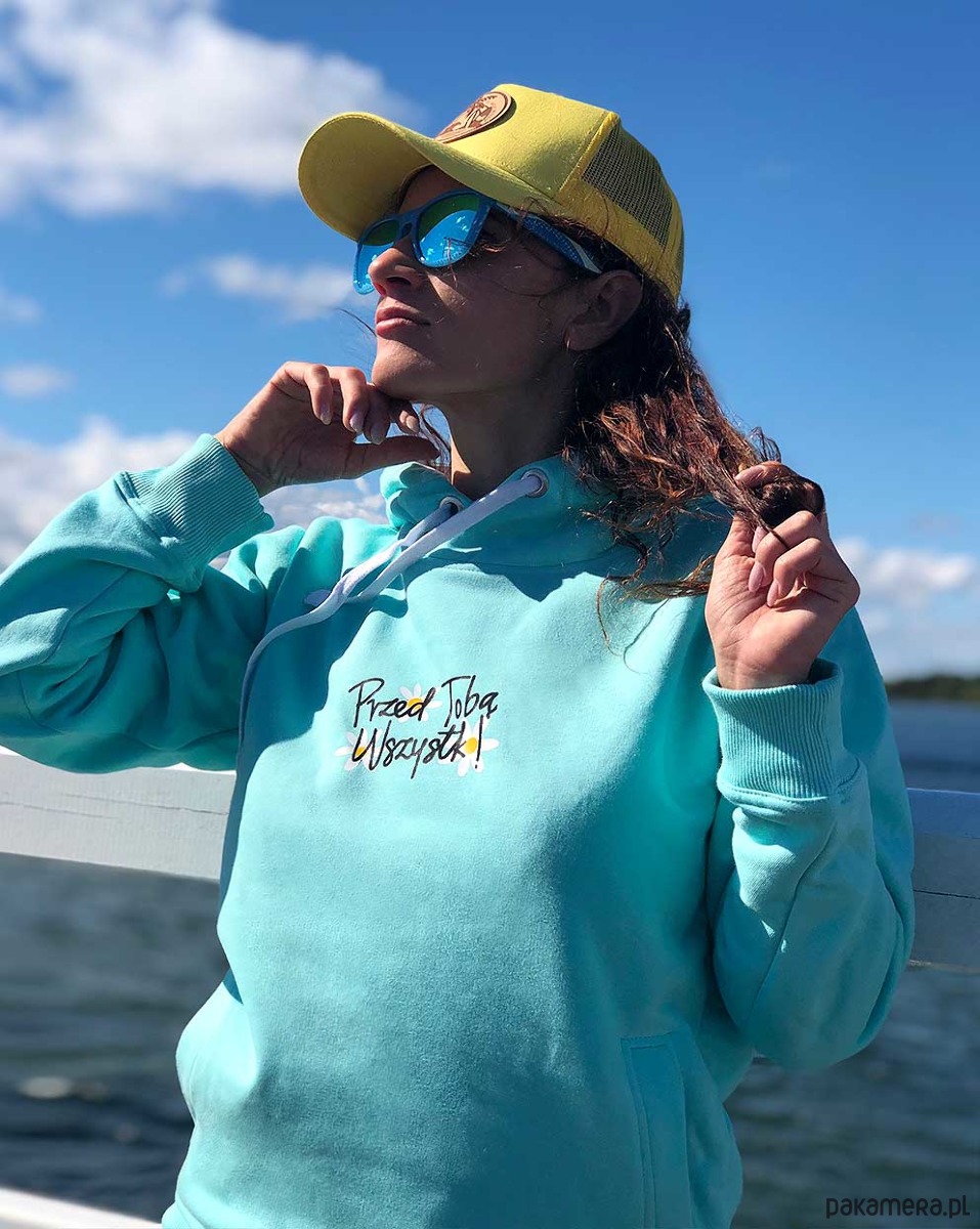 Miętowa bluza damska z kapturem i napisem Przed Tobą wszystko