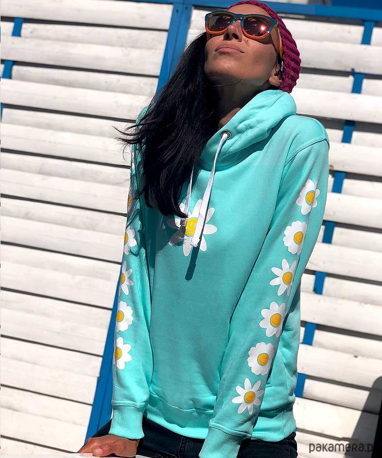 Świetna miętowa bluza damska z nadrukiem na rękawach i na środku bluzy . Pastelowa Bluza damska z kapturem ma kieszonki i jest bardzo ciepła, uszyliśmy ją z wysokogatunkowej bawełny z certfikatami oeko-tex. Kaptur w bluzie jest wypełniony szarą dzianiną aby kontrastował z kolorem bluzy.