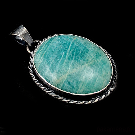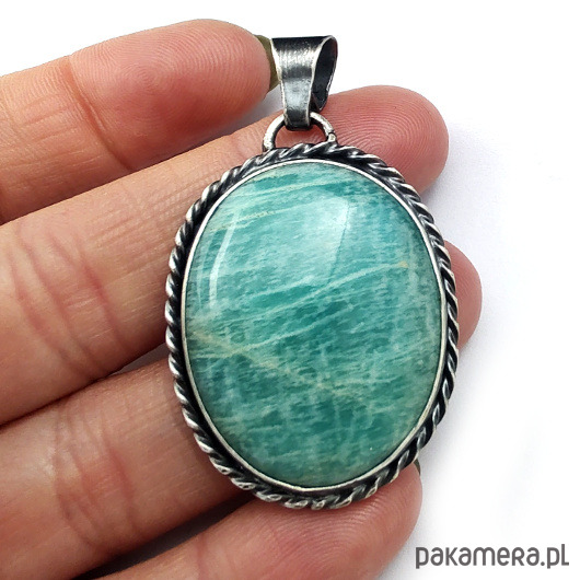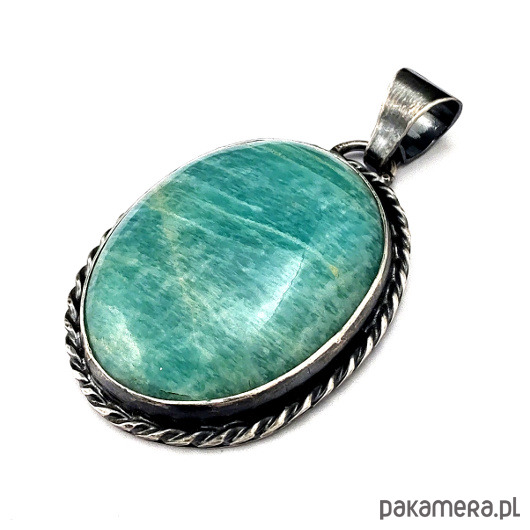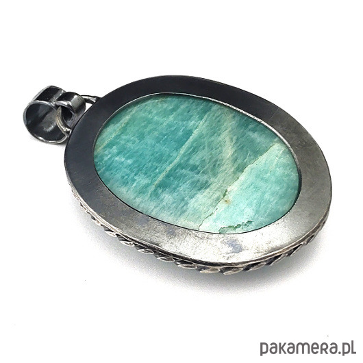 Wisior wykonany własnoręcznie z oksydowanego srebra próby 925 oraz naturalnego amazonitu o pięknej barwie. Wymiary oprawy 38 x 28 mm. Długość z krawatką 50 mm. Waga 16 g. Wisior zostanie zapakowany w ozdobne pudełeczko.