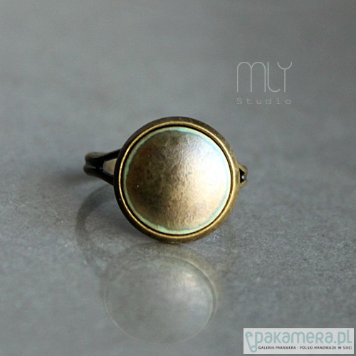 Efektowny pierścień z ceramicznym oczkiem, ręcznie wykonanym z jasnobeżowej gliny kamionkowej, poszkliwionym mieszanką szarych metalicznych i miętowozielonych szkliw z efektem plamek.Obrączka regulowana w kolorze starego złota, średnica oczka ok 12mm. Polecam