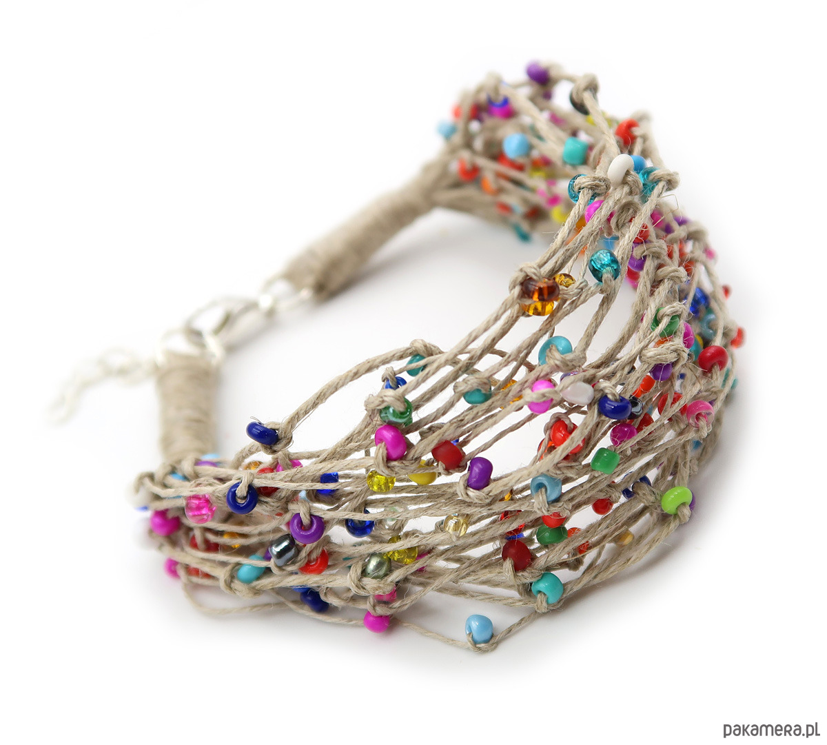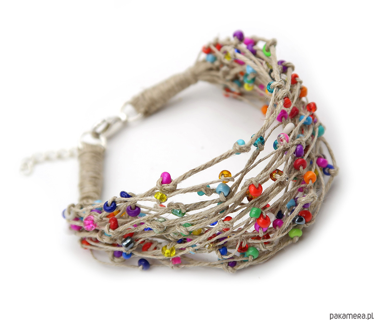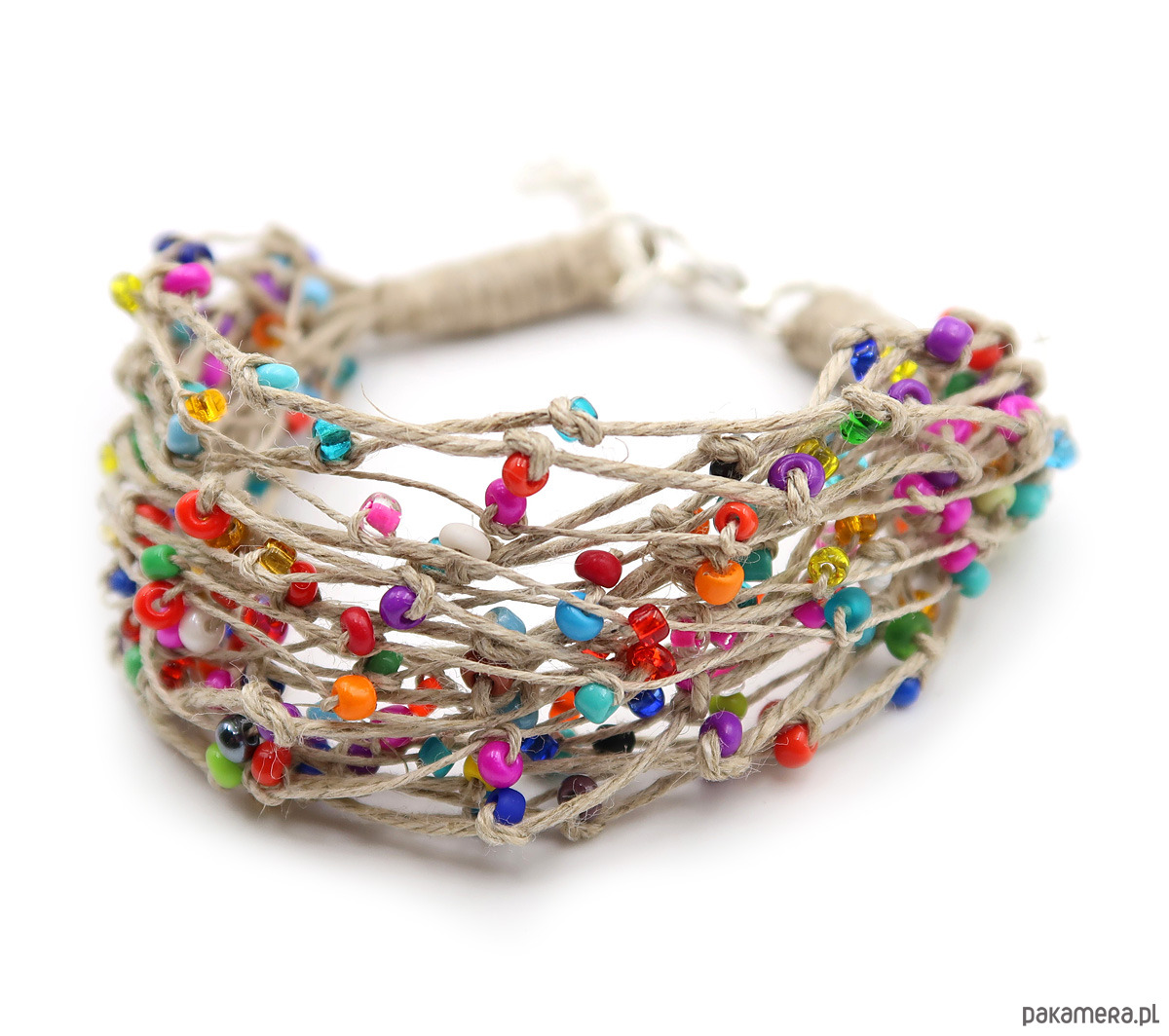 Delikatna i romantyczna migotka wykonana na bazie naturalnej przędzy lnianej z setek wielobarwnych koralików szklanych czeskiej firmy Jablonex. Idealna do letniej garderoby, naturalnych tkanin i świetnie wpasowująca się w styl boho.