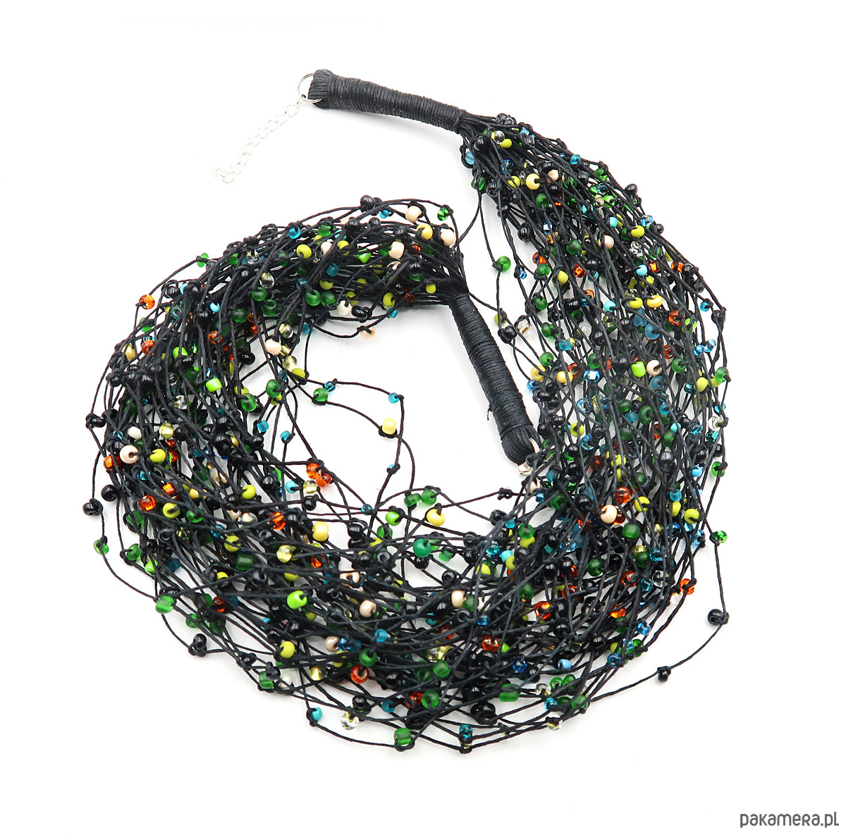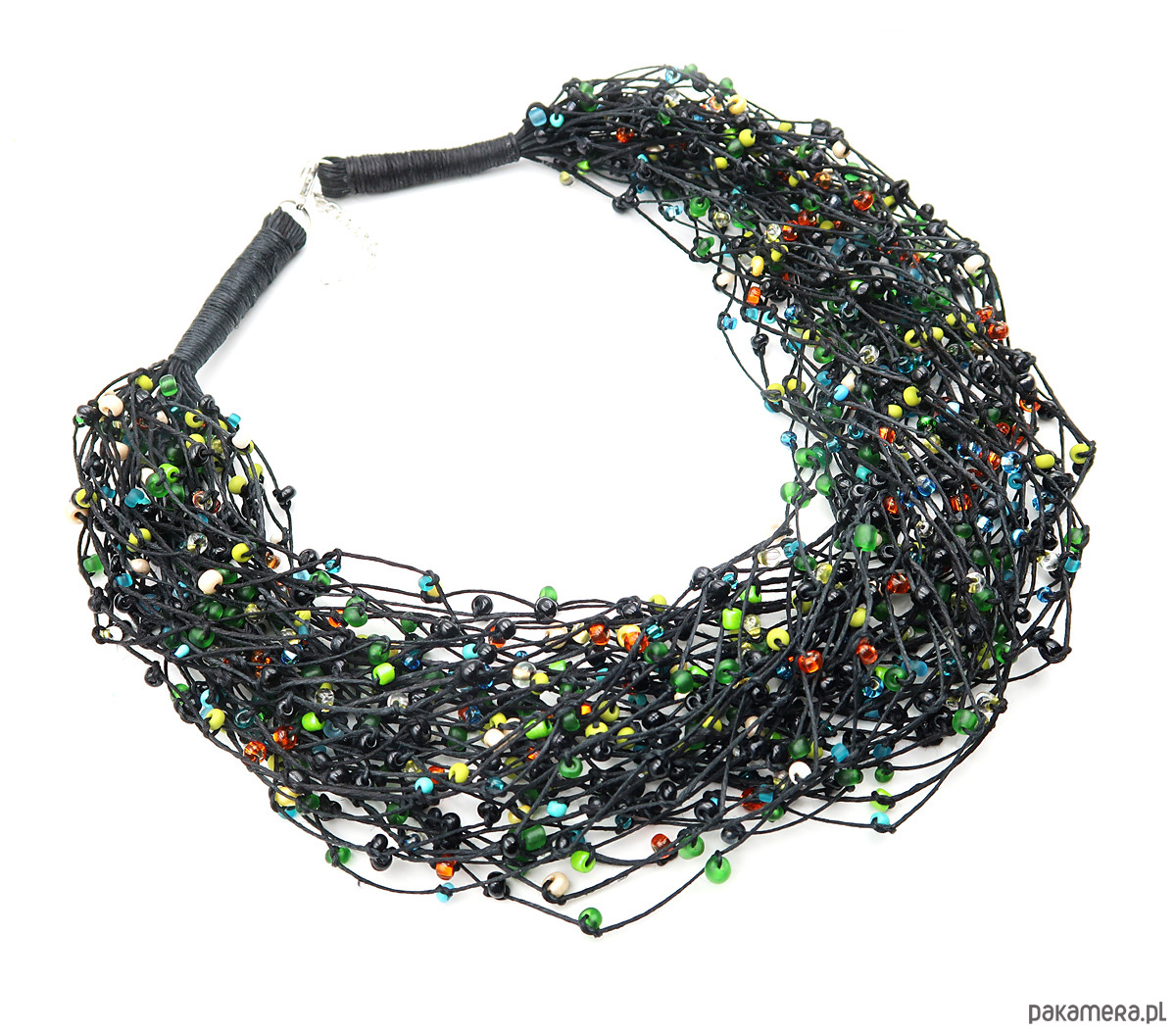 Wykonana ręcznie z kilkudziesięciu sznurków naturalnej przędzy lnianej w kolorze czerni. Uzupełniają ją drobne, wielobarwne koraliki szklane marki Jablonex, które subtelnie migoczą w świetle – jak poranna rosa na mchach.