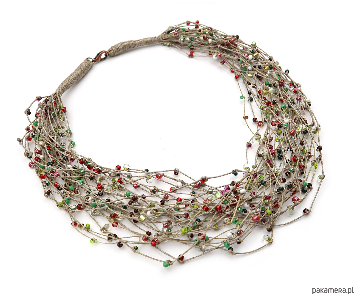 Naszyjnik wykonany na kilkudziesięciu sznurkach naturalnej przędzy lnianej z wielobarwnych drobnych korali szklanych Jablonex. Długość mierzona po zapięciu ok.50 cm, zapięcie miedziany karabińczyk.
