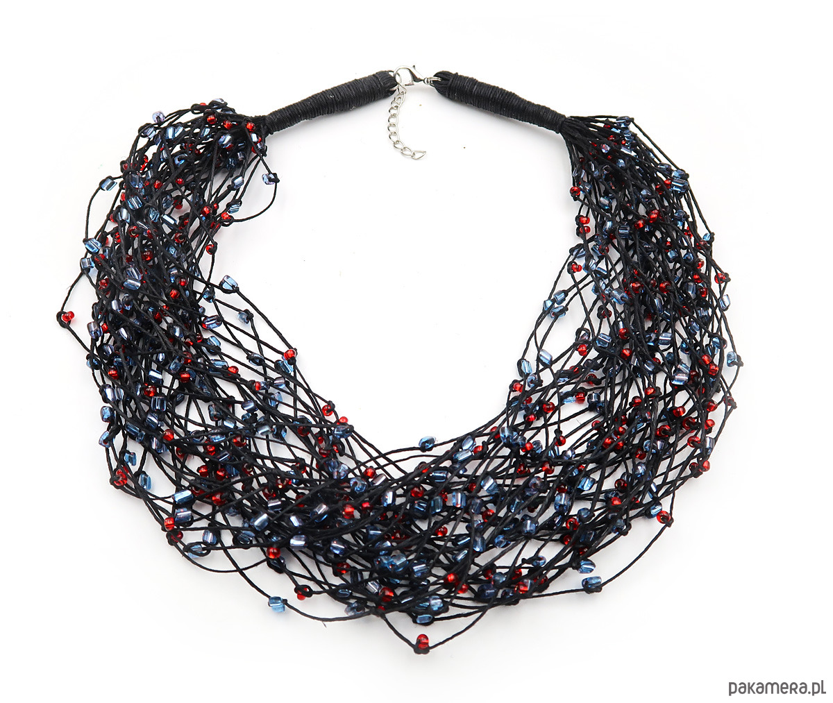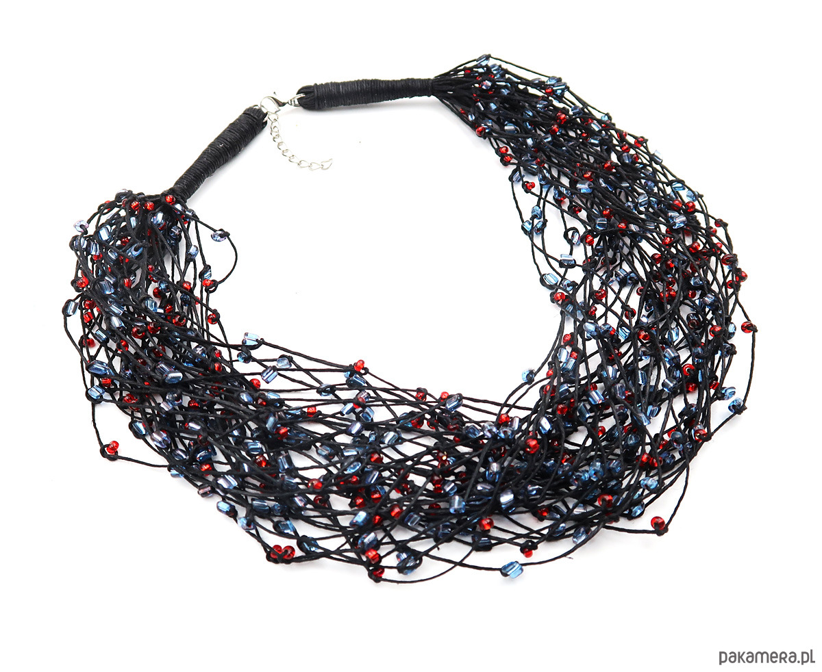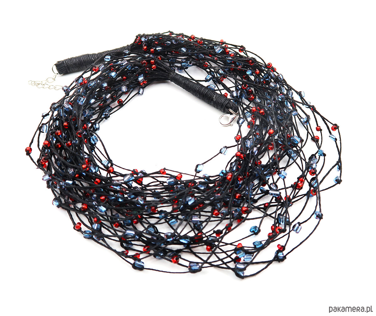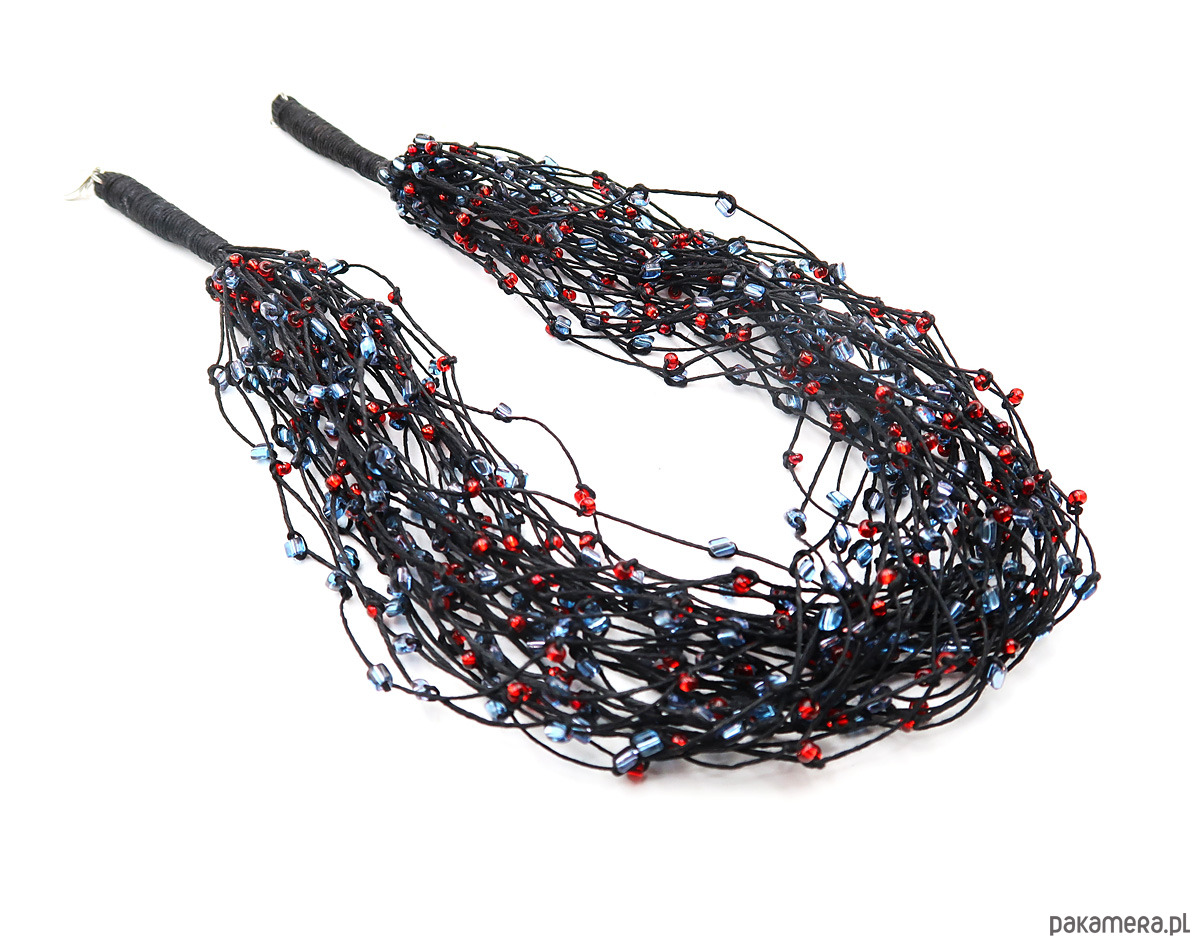 Naszyjnik został wykonany na kilkudziesięciu sznurkach naturalnej przędzy lnianej barwionej na czarno, w które wpleciono szklane korale Jablonex. Zestawienie głębokiej czerwieni i błękitu na tle czarnej przędzy nadaje mu wyjątkową głębię i elegancję.