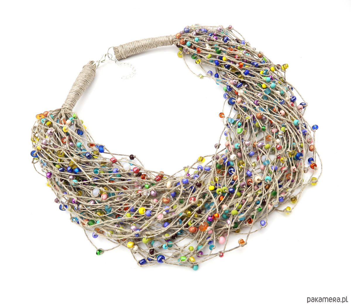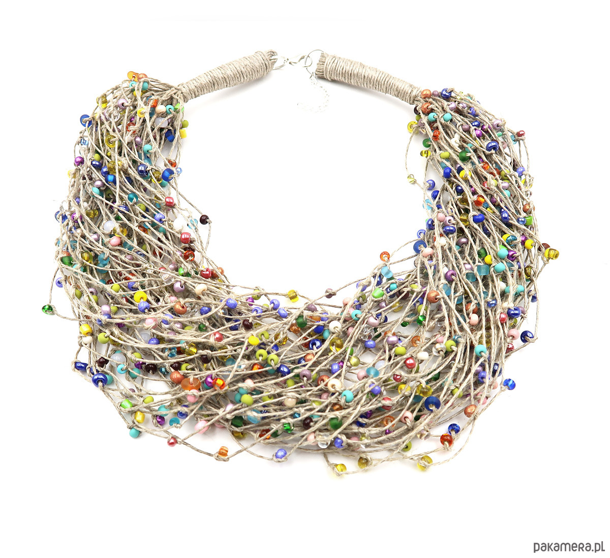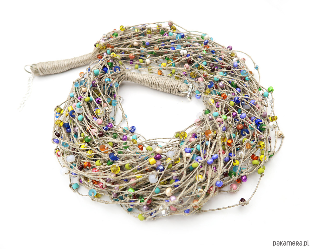 Wykonana ręcznie z kilkudziesięciu sznurków naturalnej przędzy lnianej. Uzupełniają ją drobne, wielobarwne koraliki szklane marki Jablonex, które subtelnie migoczą w świetle – niczym poranna rosa na mchu.