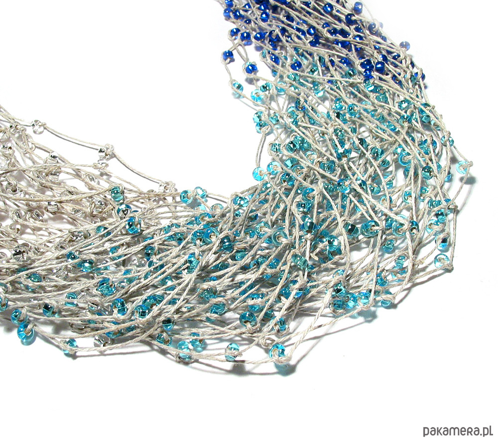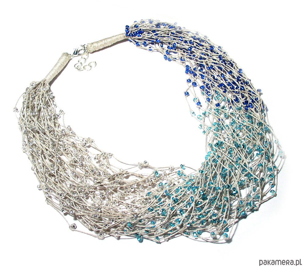 Delikatna i romantyczna migotka wykonana na bazie naturalnej przędzy lnianej z setek koralików szklanych czeskiej firmy Jablonex. Utrzymana w kolorystyce lekkich błękitów, ultramaryny i szkła transparentnego. Idealna do letniej czy letniej garderoby, naturalnych tkanin i świetnie wpasowująca się w styl boho.