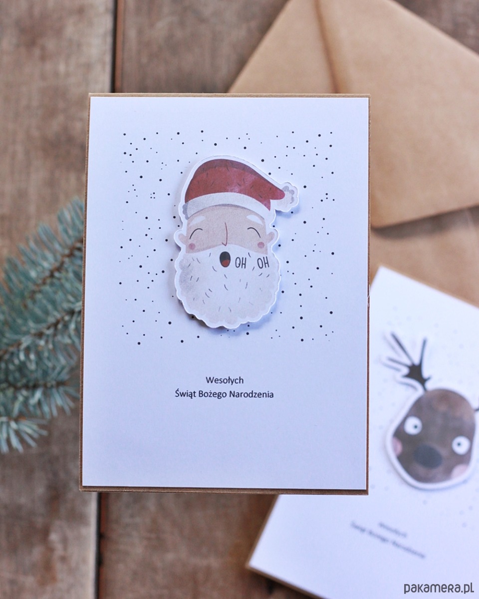 Kartka bożonarodzeniowa z zabawnym, przestrzennie naklejonym Mikołajem.