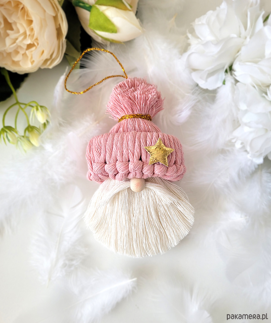 Uroczy świąteczny Mikołaj z czapką w pudrowym różu. Broda ecru.