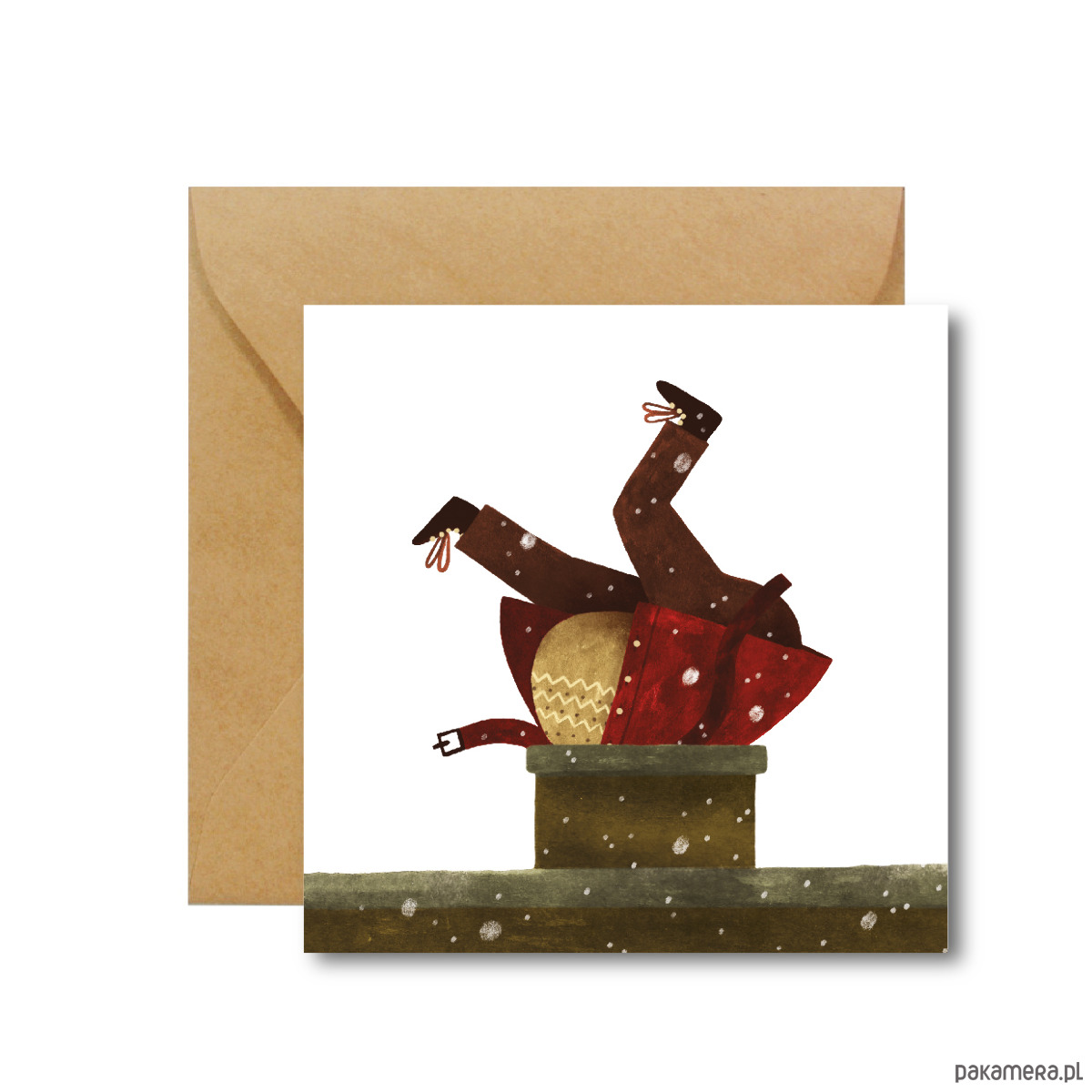 Odkryj wyjątkową kartkę świąteczną z Mikołajem przeciskającym się przez komin, idealną na Boże Narodzenie. Ręcznie ilustrowana kartka rozgrzeje serca i wywoła uśmiech. Prześlij ją komuś wyjątkowemu, dodając humoru do świątecznych życzeń.