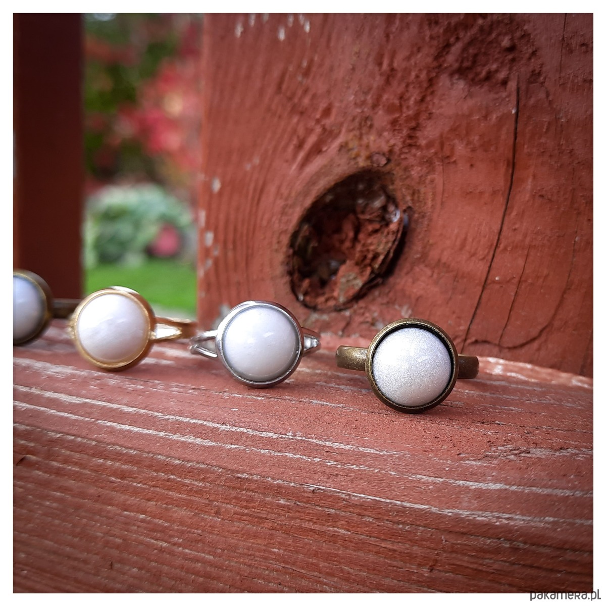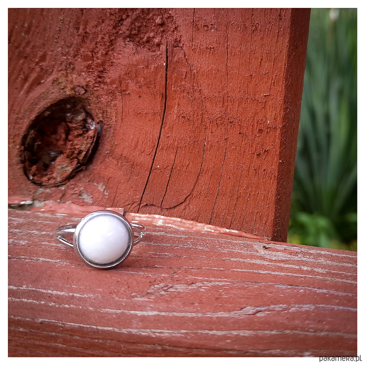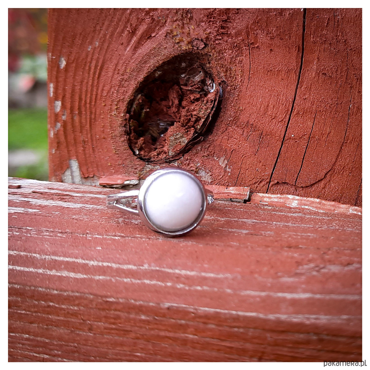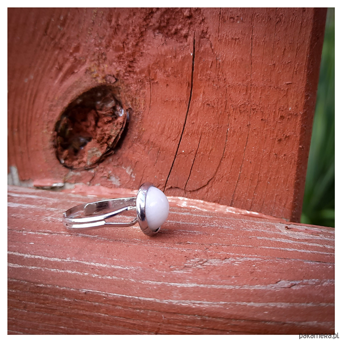 Delikatny pierścionek z żywicy epoksydowej z białym oczkiem.