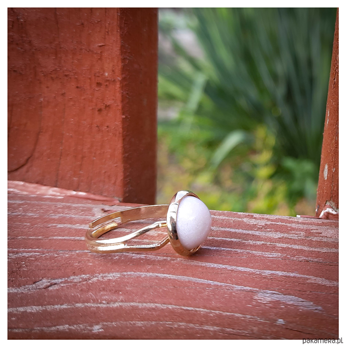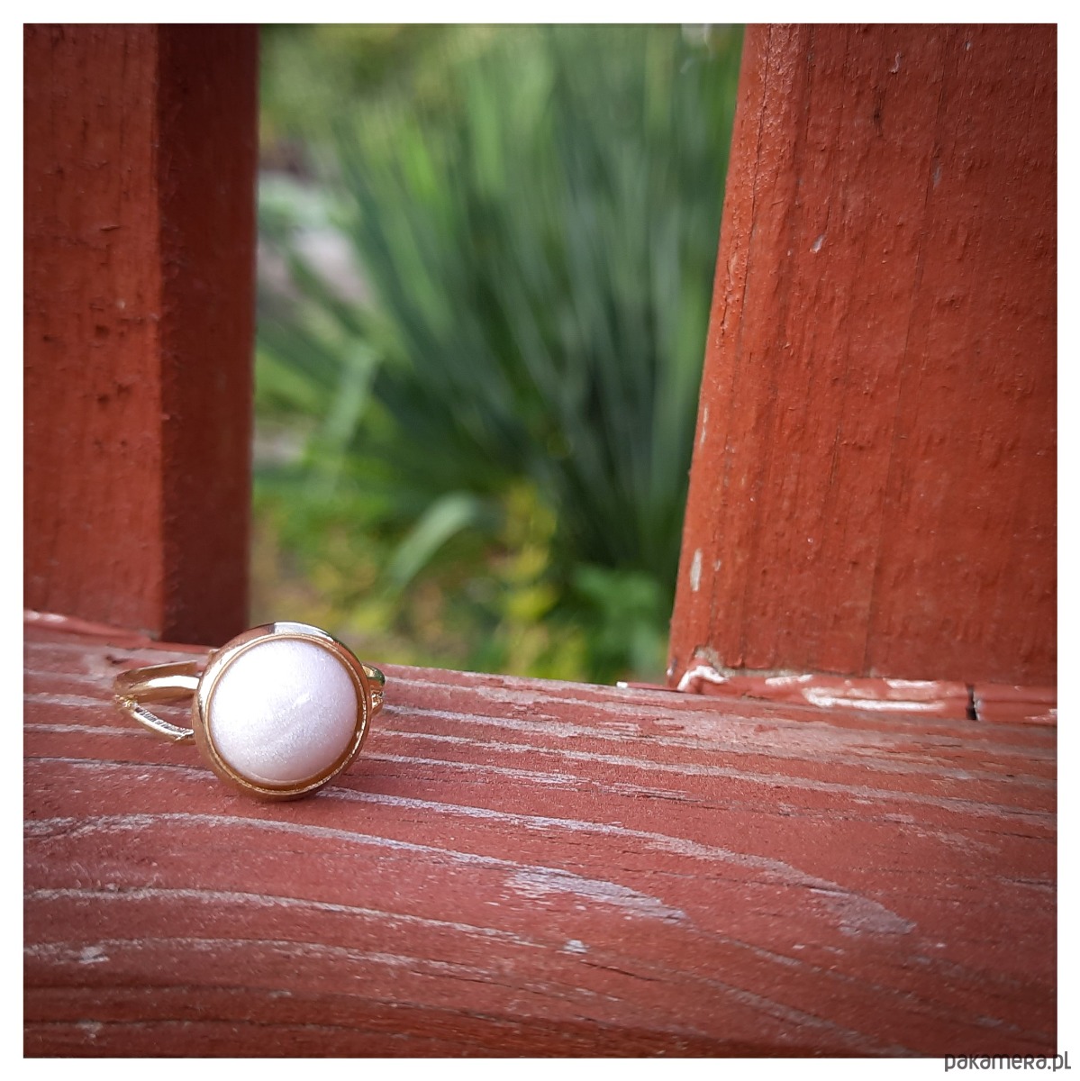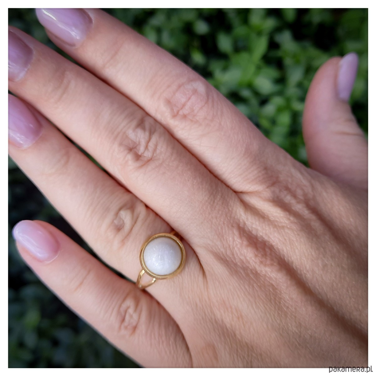 Delikatny pierścionek z żywicy epoksydowej z białym oczkiem.