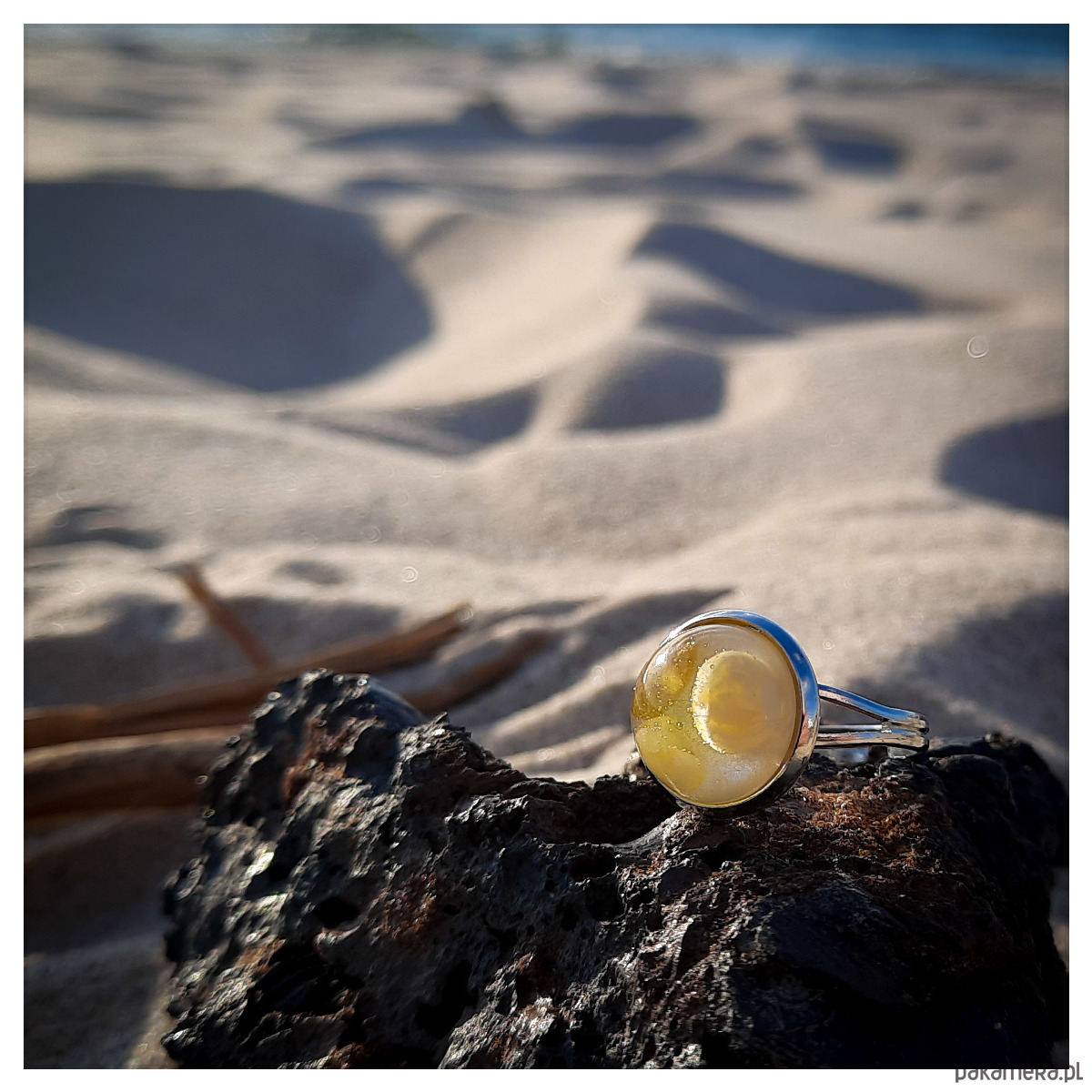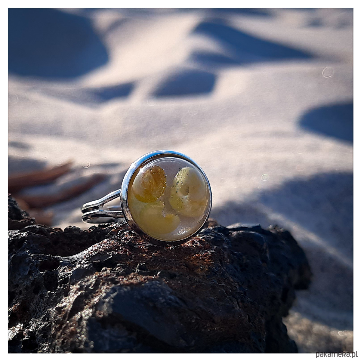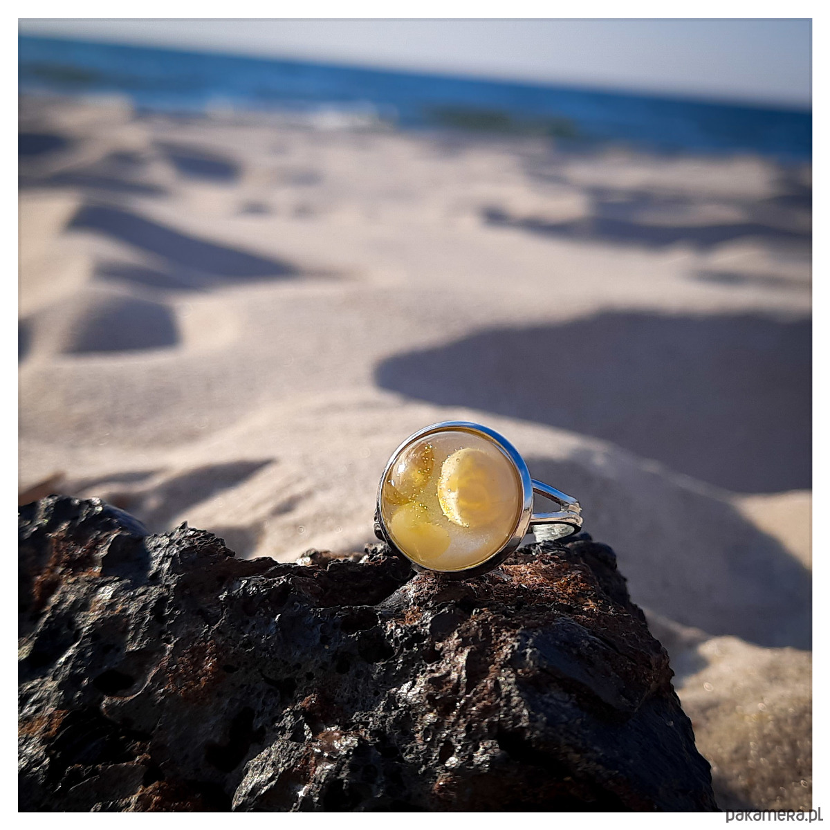 Pierścionek z zatopionym w żywicy epoksydowej bursztynem na perłowym tle.