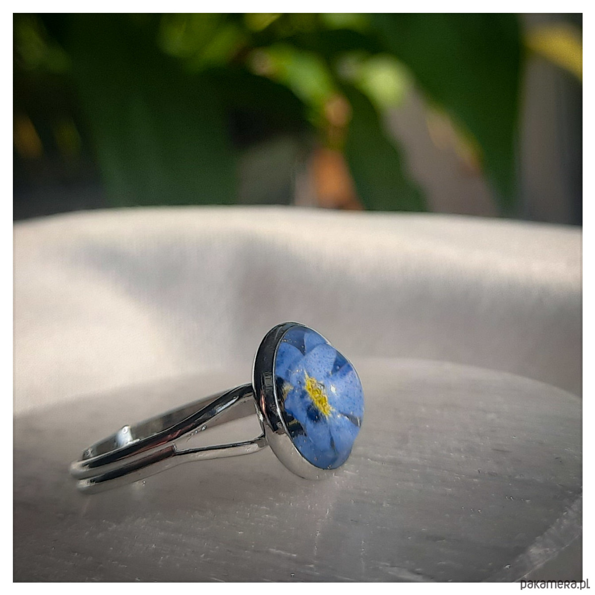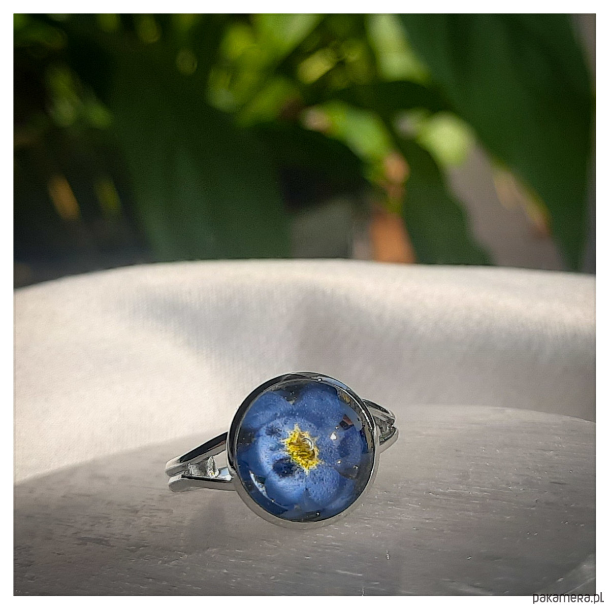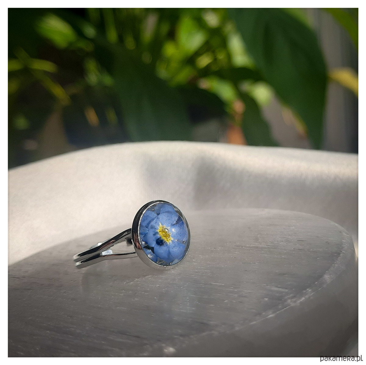Pierścionek z zatopionymi w żywicy epoksydowej niezapominajkami.