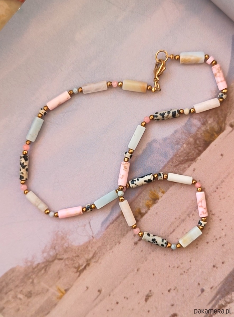 Naszyjnik z naturalnych kamieni: awenturynów,agatów i jaspisu oraz złotych hematytów na nici jedwabnej i z wykończeniami ze stali chirurgicznej.Dlugość 42cm.