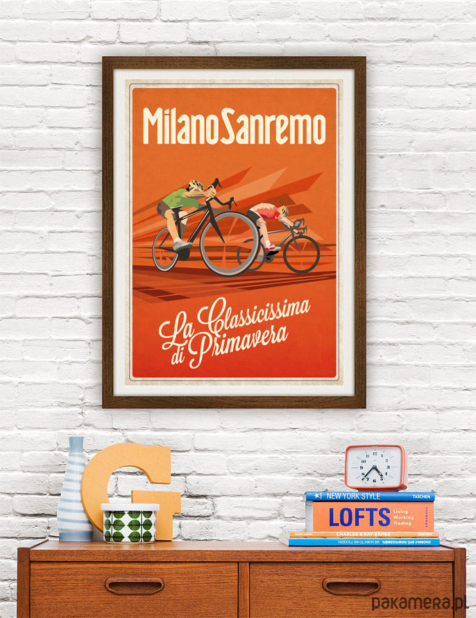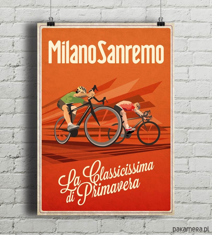 Plakat w stylu vintage z autorską grafiką inspirowaną jednym z najsłynniejszych klasycznych wyścigów kolarskich Milano-Sanremo odbywającym się we Włoszech.