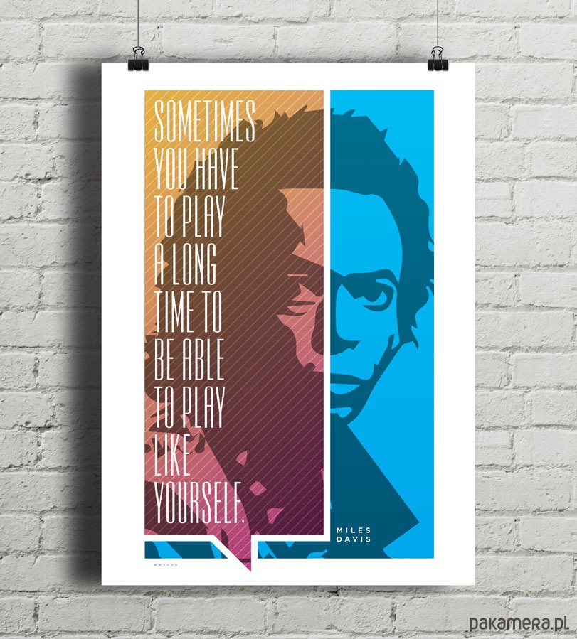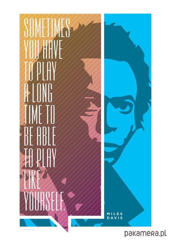 Plakat z autorską grafiką inspirowany postacią Milesa Davisa i jego wypowiedzią "Sometimes you have to play a long time to be able to play like yourself".