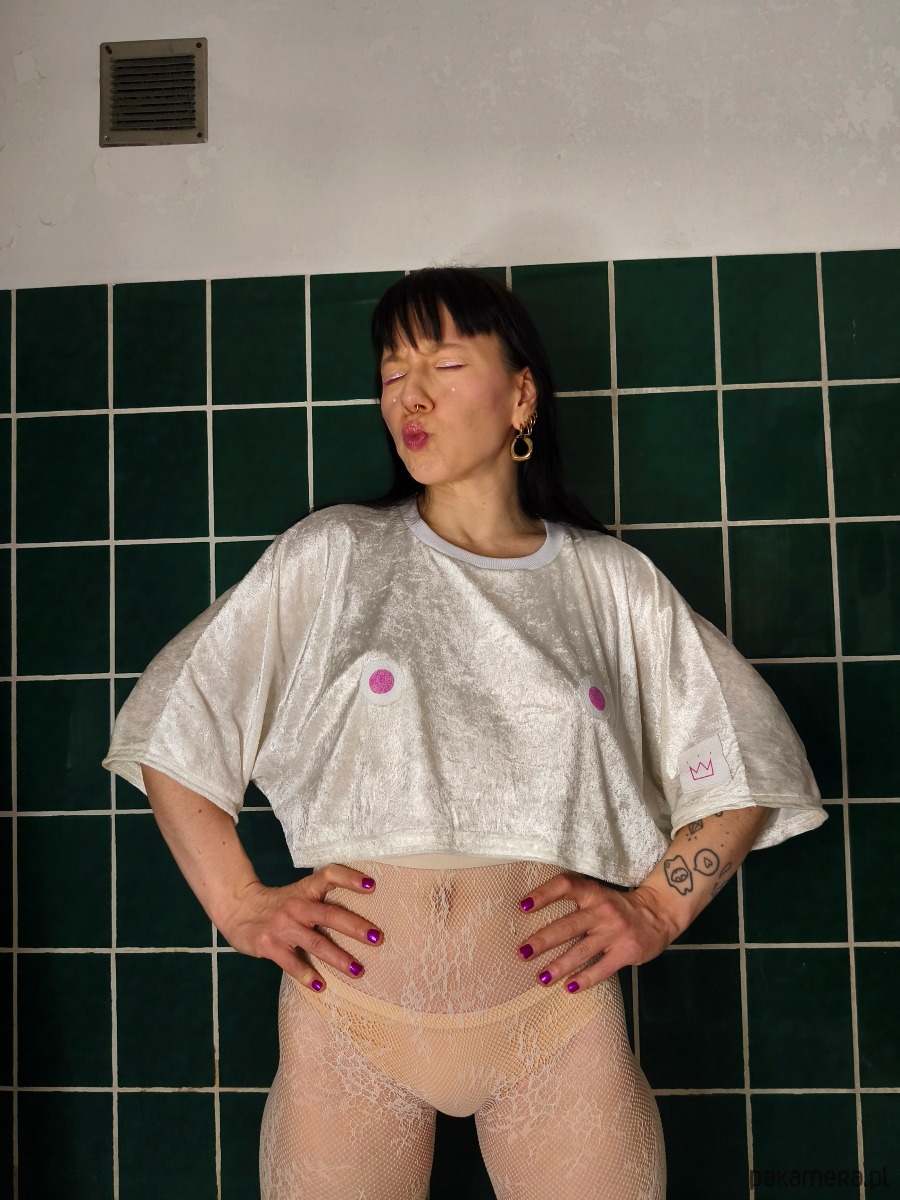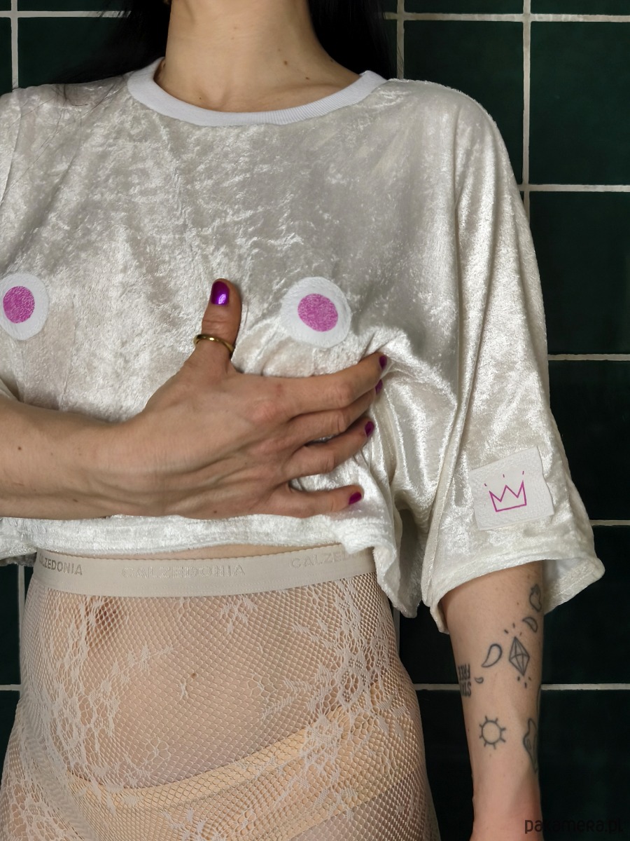 Na piersi dwie okrągłe naszywki-cycki.