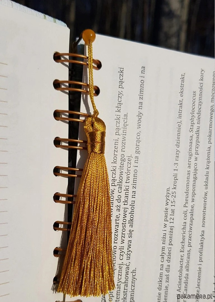 Miłorząb – elegancka złota zakładka z metalowym liściem miłorzębu, koralikiem i chwostem.