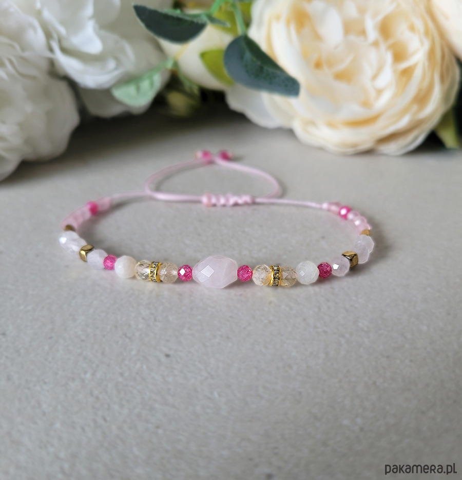 Przepiękna delikatna bransoletka zrobiona z kamieni naturalnych: Kwarcu różowego, Cytrynu, Kamienia księżycowego, Hematytu w kolorze złota oraz Cyrkonii.