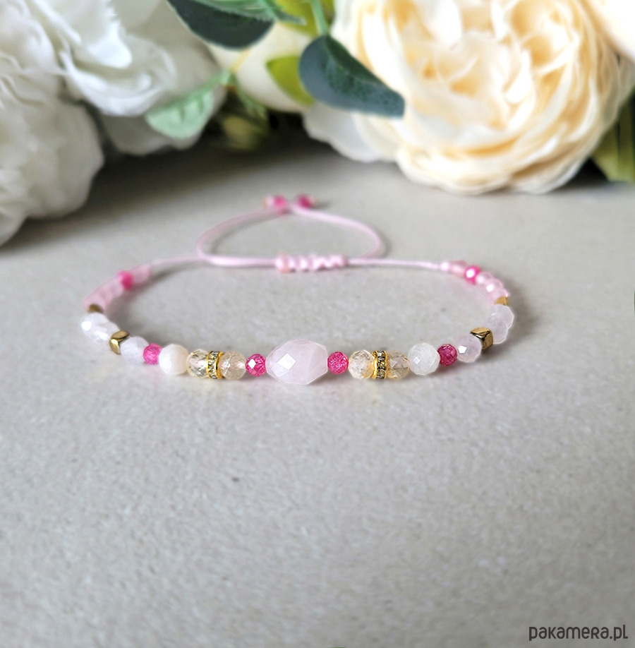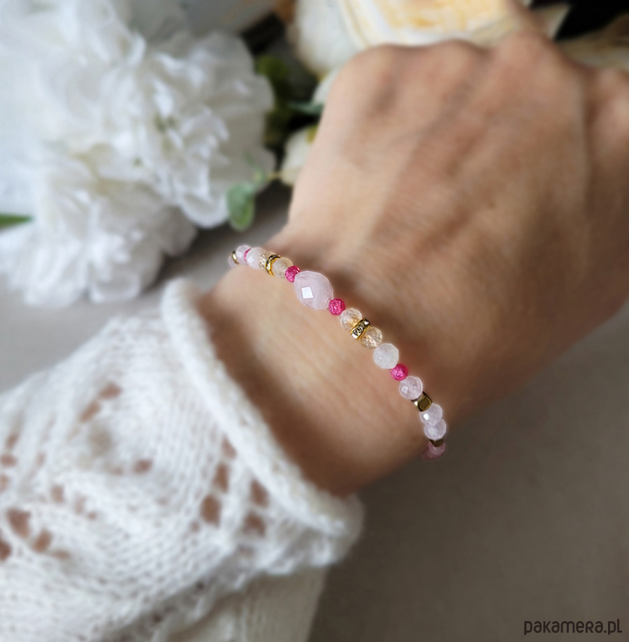 Przepiękna delikatna bransoletka zrobiona z kamieni naturalnych: Kwarcu różowego, Cytrynu, Kamienia księżycowego, Hematytu w kolorze złota oraz Cyrkonii.