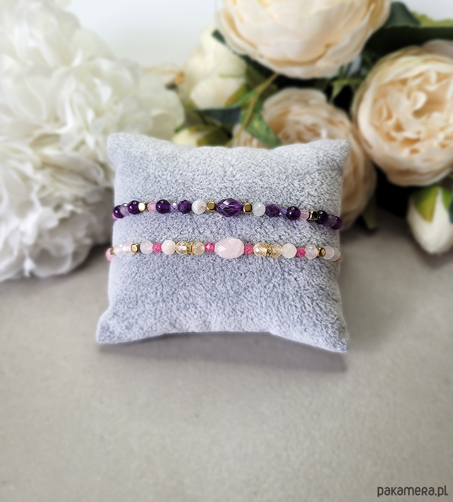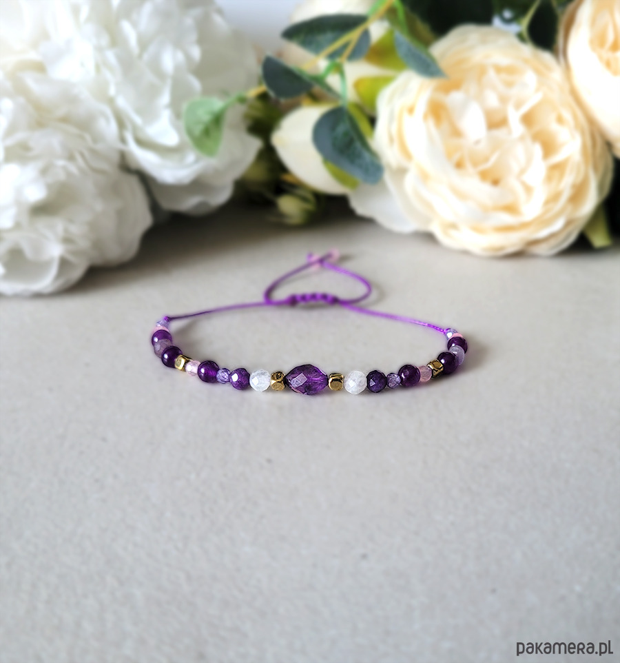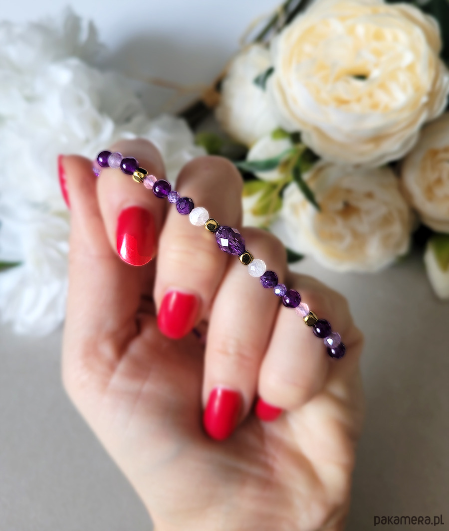 Przepiękna delikatna bransoletka zrobiona z kamieni naturalnych: Kwarcu różowego, Ametystu, Kamienia księżycowego, Hematytu w kolorze złota oraz Cyrkonii.