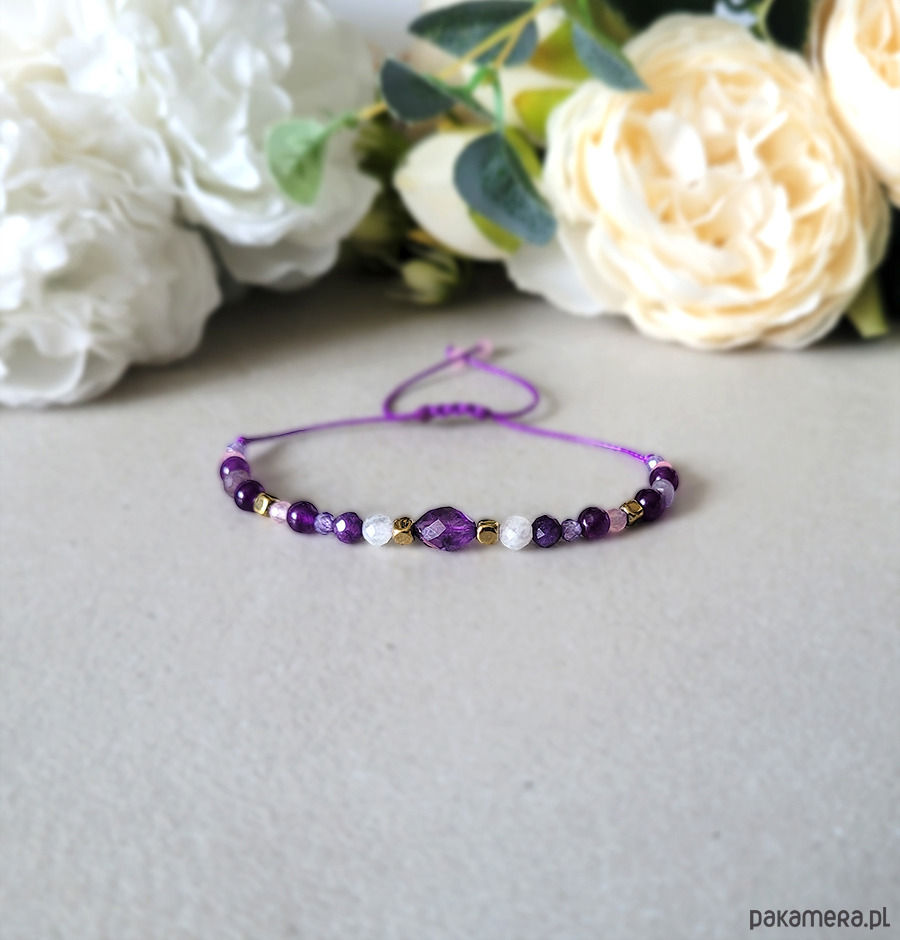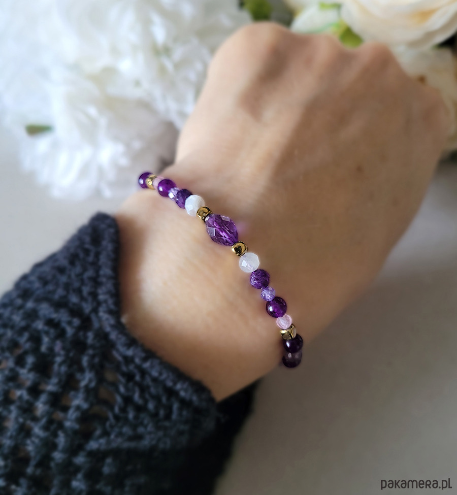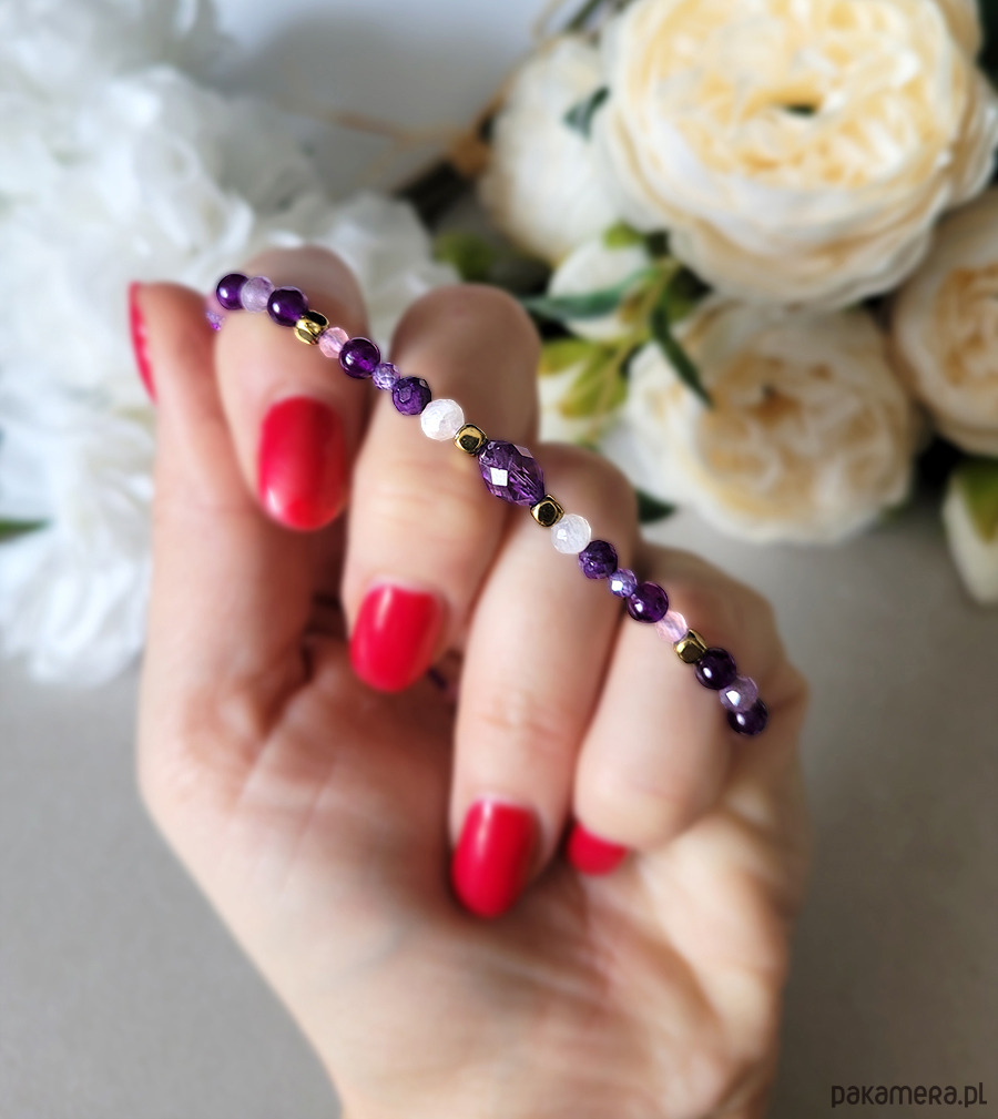 Przepiękna delikatna bransoletka zrobiona z kamieni naturalnych: Kwarcu różowego, Ametystu, Kamienia księżycowego, Hematytu w kolorze złota oraz Cyrkonii.