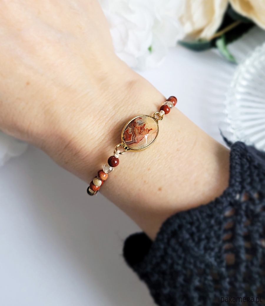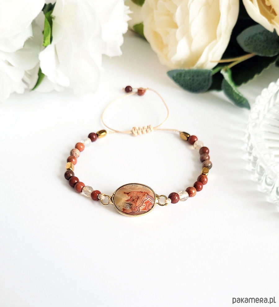 Piękna bransoletka zrobiona z kamieni naturalnych: Agatu, Cytrynu, Jaspisu czerwonego oraz Hematytu.