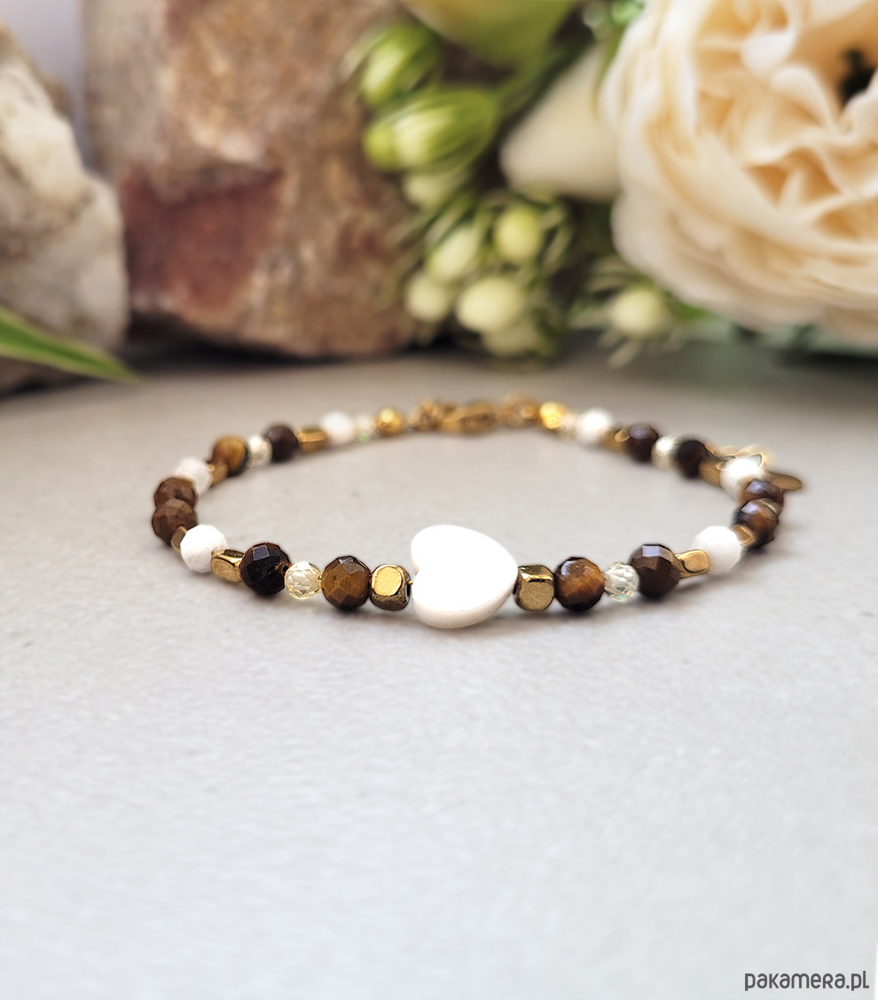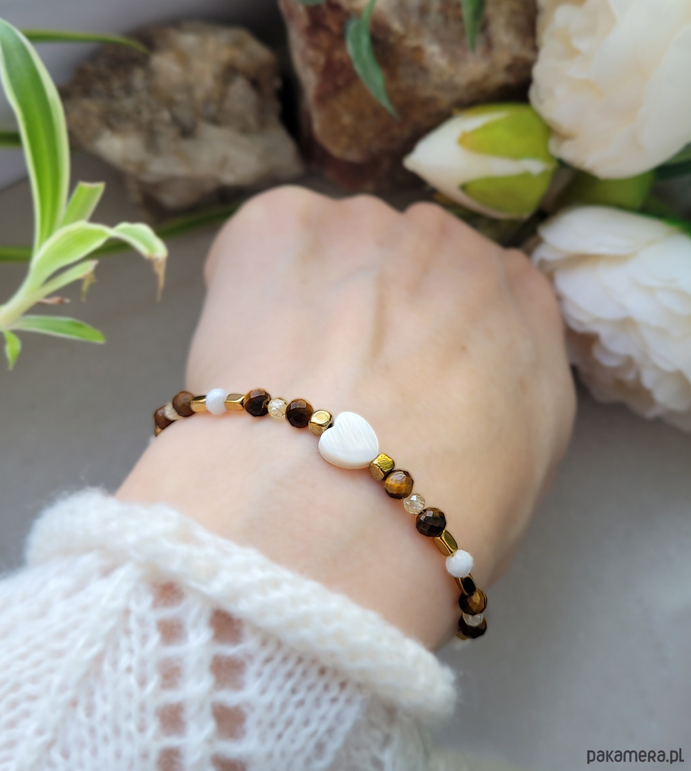 Przepiękna elegancka bransoletka zrobiona z kamieni naturalnych: Tygrysim okiem, Masą perłową, Kamieniem księżycowym, Hematytu oraz Cyrkonii.