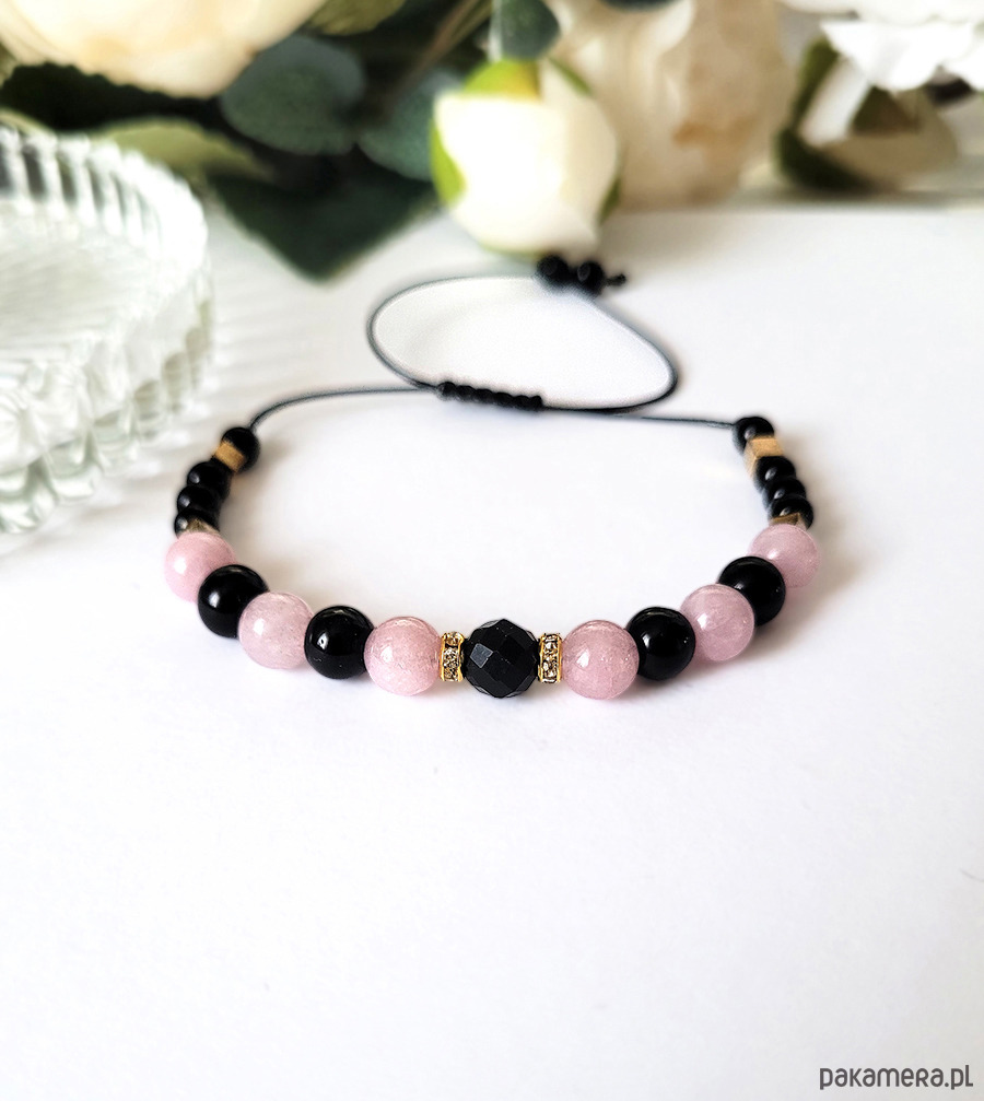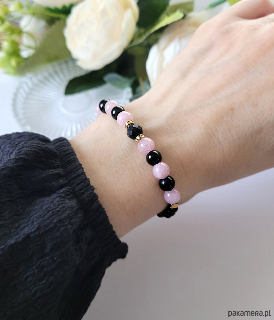 Przepiękna bransoletka z kolekcji "Queen of dark z turmalinem" z kamieni naturalnych: Turmalinu, Onyksu, Kunzytu oraz Hematytu w kolorze złota.